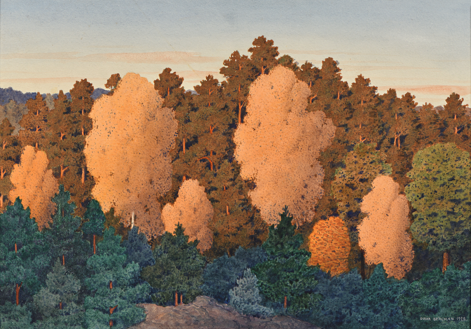 Autodidacte, Bergman s’est formé en voyageant à travers l’Europe au tournant du siècle dernier. De retour en Suède, nourri de multiples influences, du japonisme au paysage allemand du dix-neuvième siècle, l’artiste a entrepris une œuvre prolifique échappant à toute classification et tout entière tournée vers la riche nature de son pays. Oskar Bergman a parcouru toute la Suède et ses aquarelles retranscrivent avec acuité et poésie la variété de ses paysages et les changements de saisons.