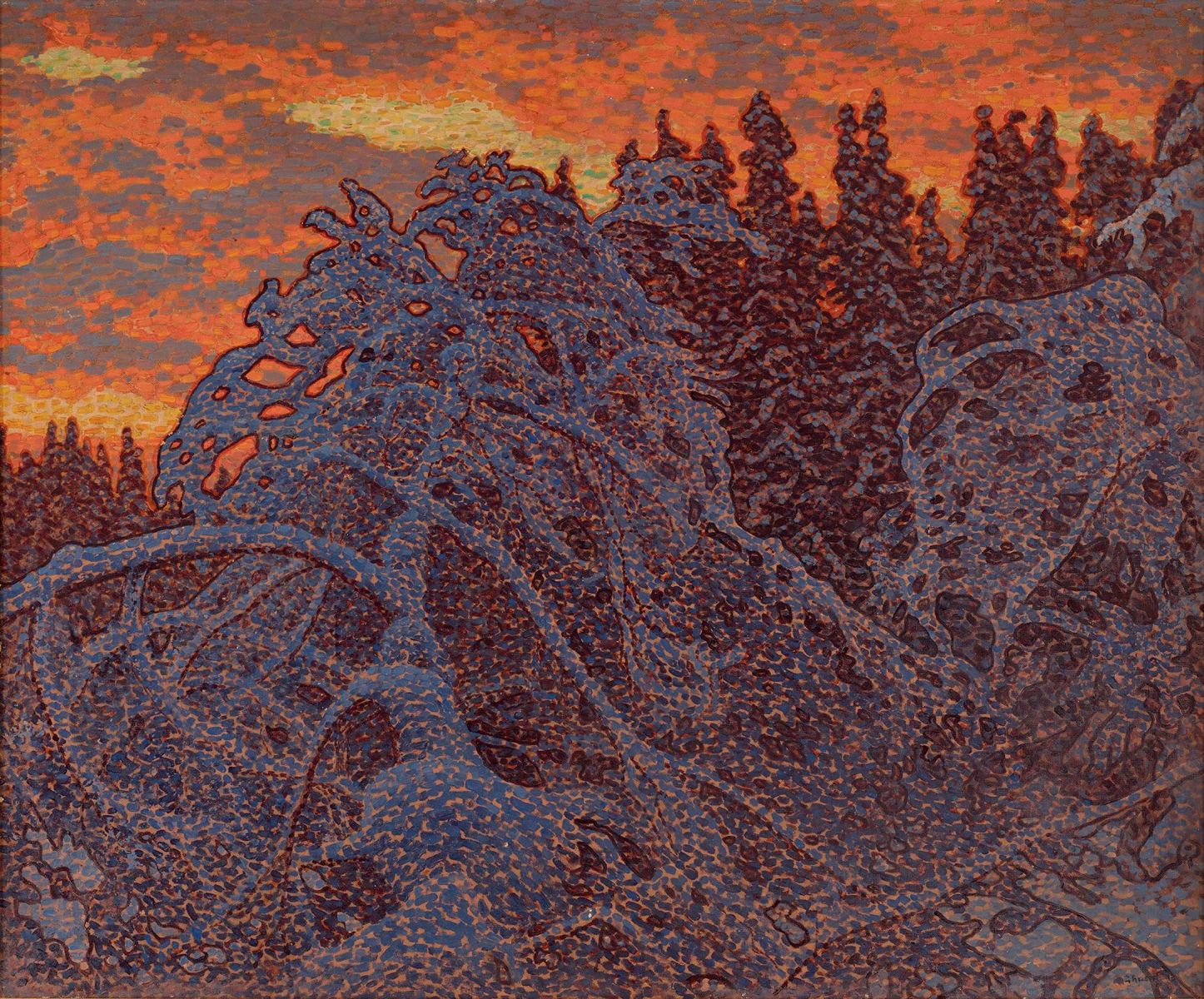 Traité avec la technique divisionniste, fréquemment employée par Fjaestad avant 1915, notre tableau se distingue clairement des productions plus décoratives tardives, par l’originalité et la qualité de sa mise en page que l’on observe dans les peintures d’avantguerre représentant la transparence de l’eau des cours d’eau vus en plongée ou les arbres pris dans une gangue de glace. L’artiste expérimente, recherche, en proposant un point de vue inédit – les branchagesdu premier plan forment un écran sur les trois quarts de la toile –, puis en découpant son motif avec un réseau de cernes s’opposant à la vibration des touches bleuté-gris qui animent la surface. Pour saisir les paysages emblématiques du Värmland, Fjaestad fait subir une stylisation aux motifs naturels, un effet de simplification qui donne une grande présence au sujet, afin d’arracher une part du mystère de ces vastes territoires. Il occupe une place singulière au sein du mouvement symboliste qui touche l’Europe entière, dont la Scandinavie par l’intermédiaire des dramaturges (Strindberg, Ibsen) qui sont particulièrement influents sur les arts visuels. Contrairement au Finlandais Akseli Gallen-Kallela, intéressé par l’épopée finnoise, Fjaestad confronte le spectateur au paysage pour lui-même et use de stratégies purement picturales (le chromatisme, l’application de la matière) pour symboliser le caractère éphémère de l’existence et son renouveau. (G.P.)