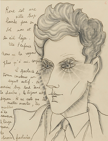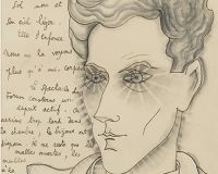 demande une oeuvre à reproduire manuscrite et que je n’écris plus, j’ajoutai quelques notes en marge pour lui faire une surprise. » Bien qu’il multiplie les stratégies figuratives, pouvant le conduire dans une planche à assimiler ses traits à une constellation, Cocteau s’en tient à un tracé de base très précis et linéaire, à l’encre, qui indique simplement le contour de son visage mélancolique. Les fragments textuels renvoient à des sentences philosophiques, relatent ses états d’âme, et évoquent le souvenir de Radiguet. Il expérimente ainsi un nouveau moyen d’expression où le dessin et le poème sont placés au même rang, dans une lecture parallèle et simultanée, sans que l’un n’illustre l’autre.