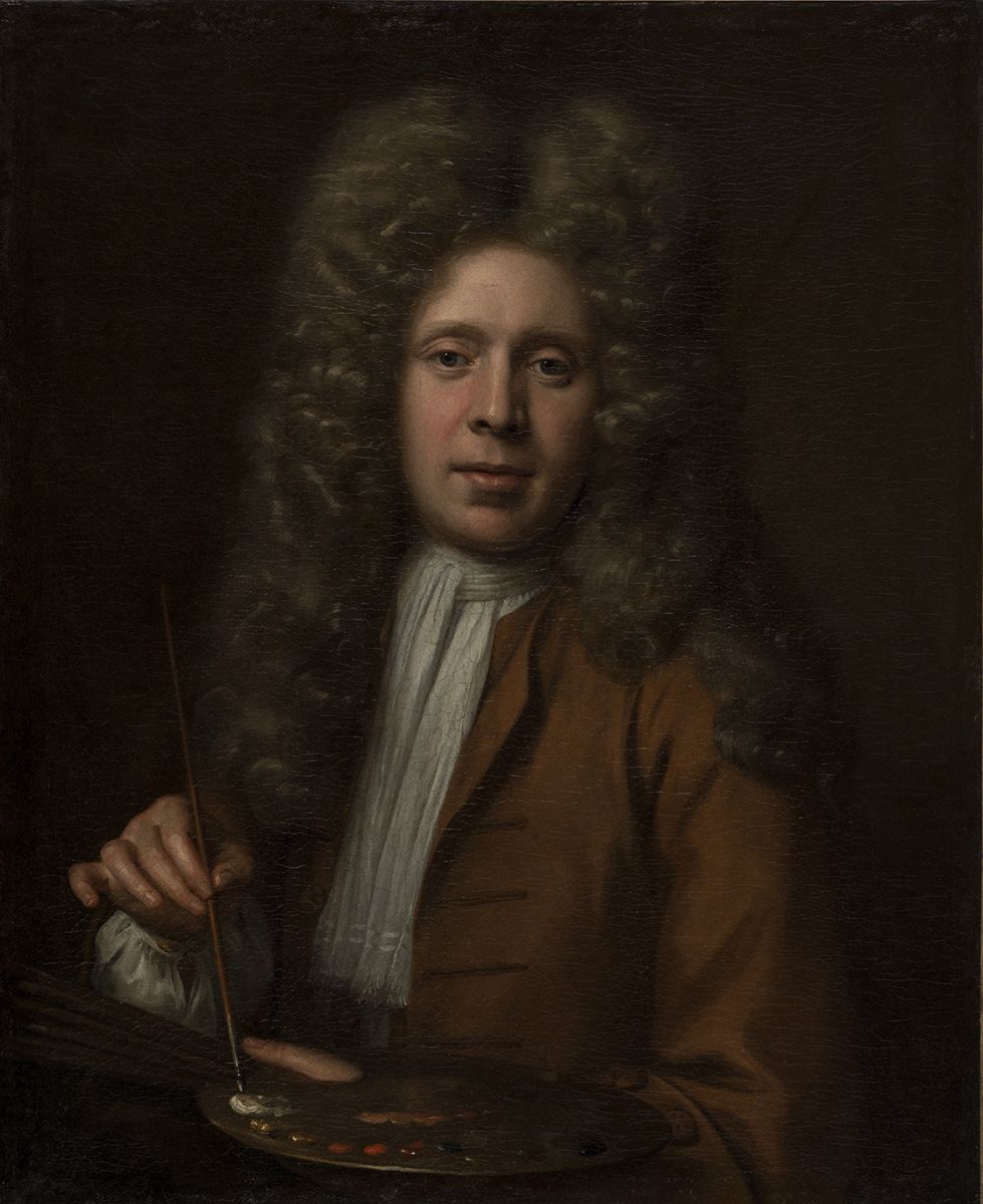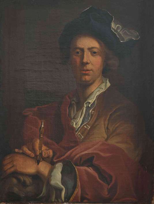 On connaissait jusqu’à présent deux autoportraits de l’artiste : l’un intime, avec sa femme, en tenue d’intérieur (Versailles, Musée national du château), gravé en 1713, le second, au musée d’Art et d’Histoire de Provence, est proche du précédent par le costume et la posture, et le montre plus âgé (ill. 1) ; il passe pour une oeuvre originale, mais sa manière plus schématique évoque un travail de copie. Notre Autoportrait, inédit, le montre sensiblement plus jeune. Il frappe par son effet d’intimité très poussé, tant par sa stricte frontalité, son cadrage serré, que par l’expression de vie qui s’en dégage : la face que l’artiste présente au miroir n’est pas un masque mais celle d’un interlocuteur complice. Excluant du champ visuel l’habituelle toile sur le chevalet, il joue de ses accessoires pour faire mine d’apporter la dernière main au portrait que l’on regarde, et met le spectateur face au vertige de l’aporie de la peinture, surface d’une illusion. (M.K.)