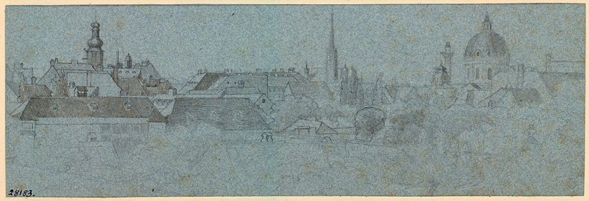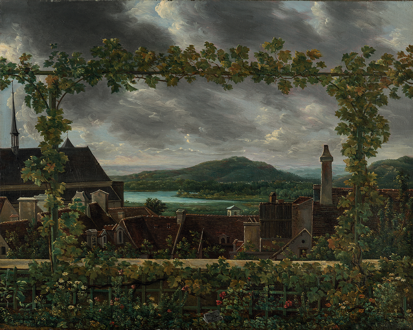 Bidauld s’est rarement laisser dicter ses compositions par la géométrie et a toujours échappé à l’ennui d’une trop stricte symétrie. S’il aime, comme ses contemporains, le contraste entre la nature verdoyante et l’assemblage cubiste de fabriques, il le projette toujours sous le ciel du Midi. Jamais il ne s’est montré aussi septentrional que dans cette vue de toitures surplombant un paysage d’Île-de-France – sans doute le lac d’Enghien vu de Montmorency, dont on reconnaît à gauche le toit de la collégiale Saint-Martin. Il est évident que c’est le caractère pittoresque du cadre végétal de la treille, formant un tableau dans le tableau, qui a séduit le peintre, l’orthogonalité de la composition étant adoucie par ses ornements botaniques. L’idée du paysage de toitures imbriquées et l’application quelque peu naïve avec laquelle il est rendu n’est pas sans rappeler le regard de paysagistes nazaréens tels que Ferdinand Olivier (ill. 1). Cependant, dénué de la spiritualité que cet Allemand investit dans son art, cet hommage rendu par Bidauld au foyer trahit la vocation intime de l’œuvre. (M.K.)