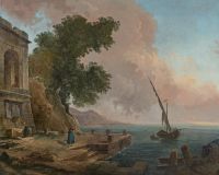L’Embarcadère méditerranéen appartient à cette production. Si son commanditaire n’est pas connu, son appartenance depuis 1846 aux collections du palais San Telmo de Séville, résidence d’Antoine d’Orléans (1824-1890), dernier fils de Louis Philippe et duc de Montpensier, et de son épouse l’infante d’Espagne Louise Fernande de Bourbon, laisse penser que sa provenance pourrait être princière. Daté des années 1770, il précède les deux premiers sommets de l’artiste dans ce genre : la série monumentale peinte pour le palais du comte Alexandre Stroganov à Saint-Pétersbourg, en 1773, et celle pour le château du comte d’Artois à Bagatelle en 1777-1779. Cette marine idéale cependant échappent aux catégories du caprice et de la veduta les plus souvent exploitées par l’artiste. Elle ne vise ni à divertir par l’accumulation de monuments pittoresques ni à surprendre par le spectacle d’une nature sublime. La sobriété de la composition, l’effet d’amplification spatiale produit par le rapport entre le proche et le lointain, l’impression de sérénité ménagée par l’inaction, l’importance donnée au motif de la felouque, tous ces éléments invitent à la contemplation. Ils inscrivent l’Embarcadère dans une histoire de la marine idéale allant du Lorrain à Friedrich, en passant par Vernet, que Robert revisite plus particulièrement ici en le dépouillant du côté anecdotique.