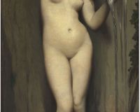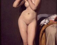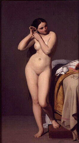 Exposée au Salon de 1841, la Femme mettant ses boucles d’oreille y fut généralement appréciée : « Le ton en est peut-être un peu brun, mais la pose est gracieuse, le dessin fin, élégant et correct ; et c’est plus qu’une étude, car la forme est pleine de volupté, et la physionomie de caractère », selon le critique de L’Artiste. Si le tableau de grandeur naturelle n’est plus localisé depuis son acquisition par le roi de Hollande Guillaume Ier à l’issu du Salon, sa réplique réduite montre qu’il s’agit d’un des plus beaux nus féminins de l’école d’Ingres, anticipant même ceux du même genre peints par le maître, tels la Vénus anadyomène (1808-1848, Chantilly, musée Condé) et La Source (ill. 2).