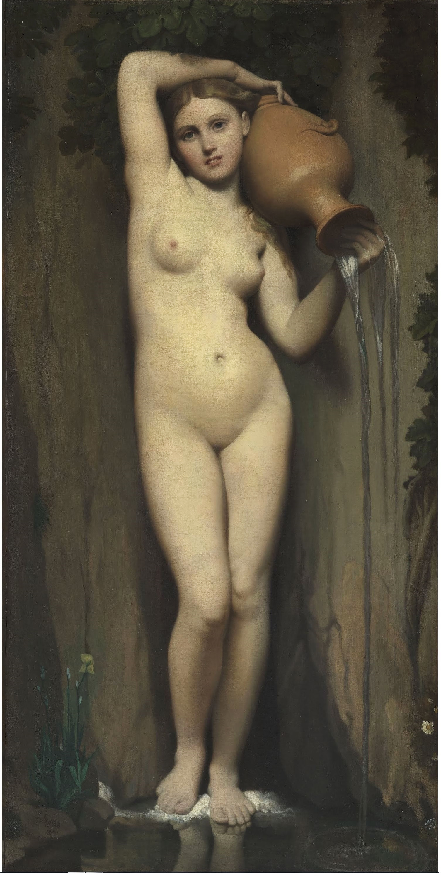 Si l’œuvre est aujourd’hui non localisée, notre réplique réduite, identifiée grâce à un modello conservé au musée Ingres de Montauban (ill. 1), permet d’en apprécier les mérites. Se détournant de l’iconographie classique qui préside à cet exercice, Jourdy a représenté une femme moderne s’apprêtant à se vêtir : la robe ainsi qu’un rang de perles sont étendus sur le lit, et leur proximité tactile augmente l’intimité avec le modèle. Dans l’intérieur dépourvu de tout ornement, rien n’en distrait la vue. L’anatomie est traitée dans la plus pure esthétique ingresque : les volumes sont simplifiés, les carnations parfaitement fondues, les courbes exaltées, et si l’étroitesse de la taille ne respecte pas le canon classique, c’est que le peintre n’a rien dissimilé de la déformation imposée au corps par l’usage du corset. Ce qui n’a pas empêché les académiciens de donner leur assentiment au morceau du pensionnaire : « Sa figure est d’un bon goût de dessin, la pose en est gracieuse et simple, les chairs sont bien modelées ». Les juges ne lui reprochèrent que le coloris « dont les teintes sont lourdes et violacées », défaut que l’artiste a corrigé dans la présente version.