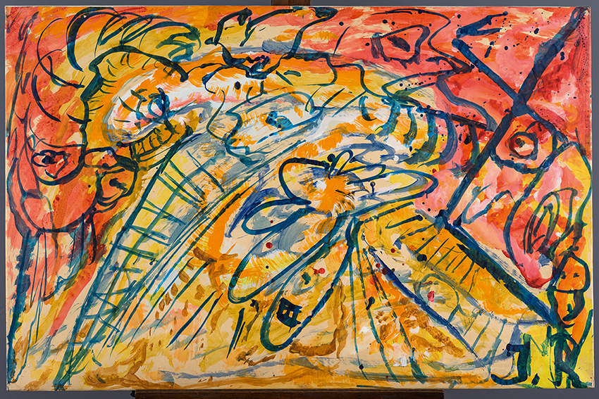 Jean Raine a côtoyé les surréalistes belges dès 1943. Il reconnaît le surréalisme comme une source intellectuelle et esthétique intarissable, qui n’a jamais cessé de nourrir ses activités de peintre et de poète, tout en refusant que son oeuvre soit enfermée dans un cadre rigide et stéréotypé. C’est d’ailleurs pour éviter ce piège que le mouvement CoBrA, auquel Jean Raine a contribué par des expositions et par la revue du même nom, a décidé sa propre mort en 1951 après seulement trois ans d’existence : « Nous n’avons pas voulu qu’il dure. Nous avons mis une fin brutale à ce mouvement pour qu’il ne dégénère pas en académisme. Mais nous savions très bien qu’il allait travailler en profondeur et continuer à inspirer, après sa fin officielle, de plus en plus d’artistes1. » Durant les années 1950, en parallèle de ses travaux d’écriture (poésie, récits, articles…), Jean Raine est avant tout impliqué dans des projets cinématographiques. Il travaille avec Henri Langlois à la Cinémathèque française et intervient sur des films à différentes étapes de leur réalisation : de l’écriture de commentaires à la réalisation, en passant par le découpage ou l’organisation de festivals. Sa collaboration artistique pour le documentaire de Luc de Heusch sur René Magritte et l’écriture du poème-commentaire de l’unique film CoBrA (Perséphone) figurent parmi ses plus importantes implications dans ce domaine. En 1951, en parallèle de la dernière exposition internationale CoBrA, à Liège, il organise le Second Festival du film expérimental et abstrait et projette pour l’une des premières fois en Europe Dreams That Money Can Buy de Hans Richter ou les films courts de Norman McLaren. Les arts visuels prennent progressivement plus d’importance dans les recherches de Jean Raine à partir de la fin des années 1950. Il réalise une centaine de peintures en utilisant du cirage, des colorants alimentaires, de l’encre, des crayons de couleur, et les fonds de tubes de peinture de Pierre Alechinsky. Au début des années 1960, il écrit Journal d’un délirium, quelques mois avant d’être atteint véritablement par ce mal qui altère fortement sa perception des couleurs. Il réalise donc de grandes encres noires sur du papier de coupe avant de renouer avec des chromatismes tranchés durant son séjour américain (1966-1968). Jean Raine découvre la peinture à l’acrylique en Californie, technique qu’il utilise d’une façon expressionniste en juxtaposant les couleurs primaires. Fracas de libellule compte parmi les vingt-cinq compositions très colorées exécutées durant l’été 1979 dans la maison atelier située sur la côte Ligure dans laquelle Jean Raine travaille à la belle saison depuis 1971. Cet ensemble se caractérise par un retour à des formes figuratives et à l’exploitation d’un répertoire de sujets tirés du réel. La série fut peinte dans la perspective d’une exposition qui s’est tenue à la galerie Détour de Namur en 1980. Par sa sensibilité littéraire et poétique, Jean Raine a souvent donné des titres très singuliers à ses peintures : l’incongruité du contraste entre l’intitulé et l’image provoque l’étonnement ou la surprise du spectateur, l’interpelle et stimule son regard. Avec Fracas de libellule, au contraire, le titre coïncide avec les formes représentées puisque l’on discerne les ailes et le corps de l’insecte et que les réseaux de traits bleu foncé sinueux animent la composition, suggèrent le mouvement soudain produit par l’animal. Jean Raine utilise une peinture acrylique extrêmement diluée qui lui permet de travailler très rapidement, d’achever la peinture en un temps concentré, dans une spontanéité propre à l’esprit CoBrA.