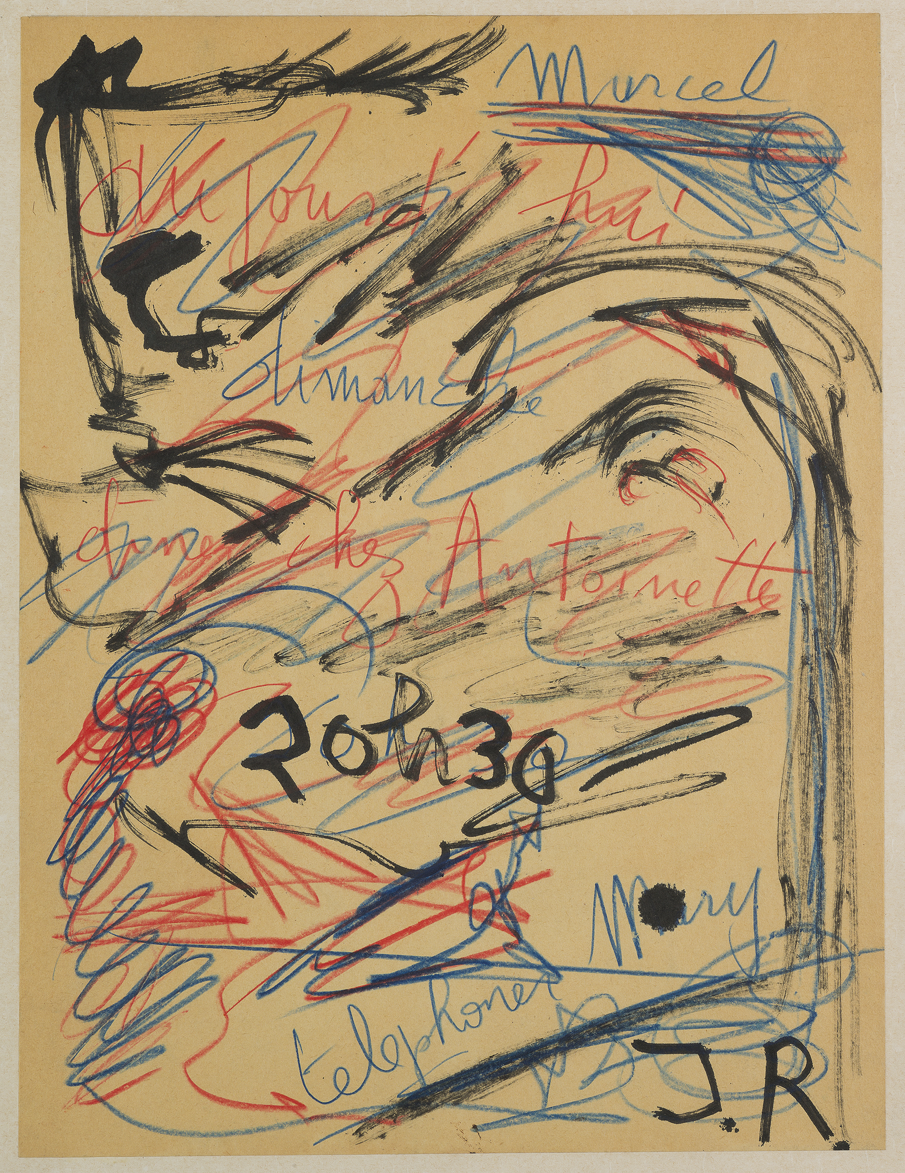 Crayons de couleur, crayon feutre à encre noire, 40 x 30,6 cm Monogrammé en bas à droite : "J.R."