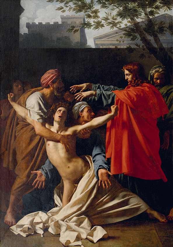 Présenté à Rome avec les ouvrages des pensionnaires du 15 au 31 mai 1818, Jésus guérissant un possédé du Démon ne fut exposé à Paris qu’au Salon de 1827 où il reçut un accueil favorable. Auguste Jal, entre autres, le jugea « digne d’estime, dans le genre sévère et simple de quelques-uns des anciens maîtres italiens en présence desquels il l’a composé et exécuté8 ». (M.K.)