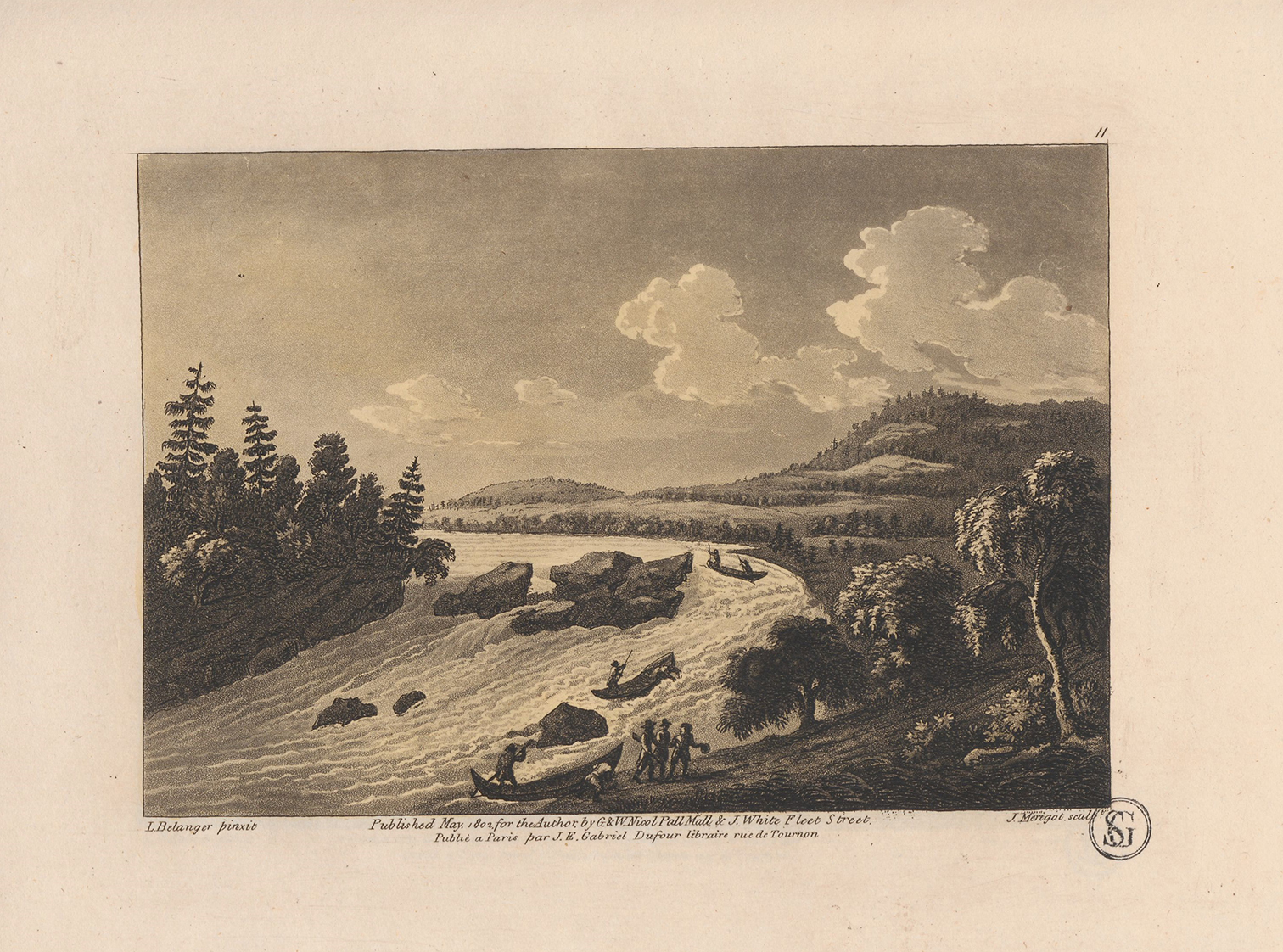 Les compositions pittoresques de Bélanger destinées à être gravées pour le recueil de Saint-Morys visaient à satisfaire la curiosité du public continental pour l’exotisme hyperboréen; leur traduction à l’aquatinte par Mérigot les ont quelque peu schématisées pour les conformer à leur fonction illustrative. D’ordre ethnographique, le commentaire de la Vue de la Cataracte de Kattila Koski (ill. 1) s’intéresse aux pratiques de navigation autochtones plus qu’au paysage2. À l’inverse, notre Cataracte de Kattilakoski est l’oeuvre d’un peintre. Fasciné par l’étendue et la beauté du phénomène naturel, Bélanger s’est mis de plain-pied avec le fleuve pour mieux traduire la rapidité de son cours, créant l’illusion d’une immersion imminente. Avec sa barque piégée dans les rochers après y avoir été charriée par un débordement du fleuve, le pittoresque prend des allures de désolation qui ne sont pas sans rappeler l’oeuvre d’un maître hollandais du genre, Allaert Van Everdingen. Les hommes, désormais réduits à l’échelle de fourmis, donnent la mesure de l’immensité du paysage. (M.K.)