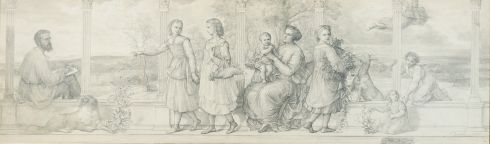 Il s’agit plus vraisemblablement du carton de présentation ou modello, à dater vers l’automne 1868, fixant le scénario, choisissant les attitudes, s’appuyant sur les croquis d’après nature, bref, montrant par avance l’aspect de la fresque à venir, dans un format plus petit, mais géométriquement conforme à la réalisation. Depuis très longtemps, Janmot prend de nombreux croquis de ses filles. Certains sont directement utilisés dans cette composition, par exemple la fillette vue de dos portant une brassée de feuillage, dessinée sur le vif en 1867 dans le jardin de Fontenay-aux-Roses; les autoportraits de l’artiste abondent, ainsi que les très jolis portraits au pastel de ses ravissantes filles. Janmot possède donc un matériel important qu’il « connaît par coeur » et qu’il transpose dans le grand dessin avec une tendre minutie et une poésie pleine de charme.