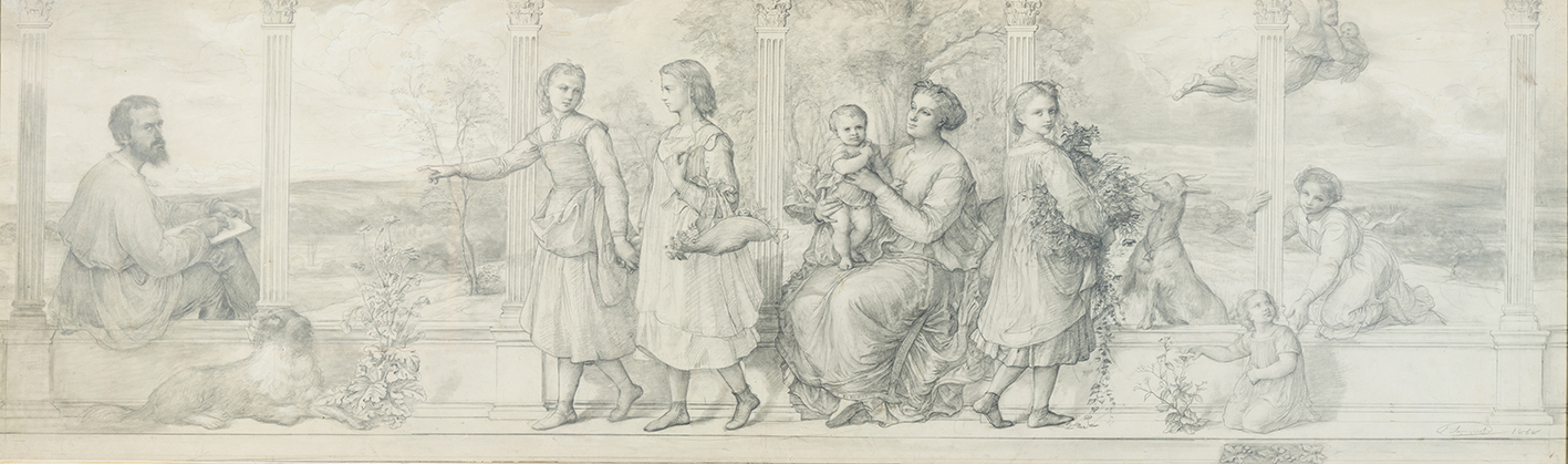 Le grand dessin révèle les nombreux détails d’une composition que Janmot peignit dans sa salle à manger et qu’il intitula La Famille, tandis que la fresque lui faisant face était intitulée Les Muses. Sur les autres murs, des paysages peints complétaient ce décor disparu. Le scénario de La Famille regroupe les neuf membres du ménage. Assis à gauche sur une murette qui sert de base à sept colonnettes cannelées surmontées de chapiteaux corinthiens, structure qui rythme le dessin sur toute sa largeur, Janmot dessine sur une feuille posée sur ses genoux croisés, les pieds cachés derrière la murette, tandis qu’un pan de sa blouse d’artiste pend du côté du spectateur. Sur l’avant-scène sont installés tous les membres de sa famille, ainsi que le chien couché, levant la tête vers un maître qui pourtant ne s’y attache guère; sa patte de devant est repliée, l’autre étendue, au pied d’une plante plus petite ici que sur le carton d’exécution. Devant la murette circulent les filles de l’artiste, autour de son épouse Léonie de Saint-Paulet (née en 1829), qui, assise, constitue le centre de la composition. Elle tient debout sur ses genoux Norbert, âgé d’un an (né en octobre 1867), qui conforte la gent masculine tant attendue pour transmettre le nom après quatre filles1. Le motif central du grand dessin rappelle les nombreuses Vierges à l’Enfant, peintes ou dessinées par l’artiste pour le marché. Les deux aînées, Cécile et Marie-Louise (nées en septembre 1857 et en septembre 1858), s’éloignent vers la gauche dans la direction du peintre en désignant le beau jardin arboré. L’autre groupe, à droite, prend la chèvre comme centre d’intérêt. Aldonce (née en avril 1860) apporte des feuillages à la chèvre dressée, qui pose les pattes antérieures sur la murette, impatiente de s’en saisir2. À l’avant-plan à droite, Maurice (né en juillet 1866, âgé de deux ans), accroupi au sol, lui offrirait volontiers la plante poussant à ses pieds ; Charlotte (née en mars 1862), qui se tient d’une main à la colonnette, agenouillée, veille sur lui. À l’arrière, un ange emporte au ciel le petit Henry (décembre 1864 – août 1865), premier garçon si ardemment désiré par Janmot ; Le Passage des Âmes du Poème de l’Âme comporte de nombreuses figures angéliques comparables. Pour autant que la photo aujourd’hui connue (ill. 1) permette de juger, sur la fresque, cet ange ombré se détachait sur un ciel éclairci par endroits, comme le profil à contre-jour du peintre. Le parc, qui a fourni à Cécile les fleurs dont sa capeline est remplie et à Aldonce sa brassée de verdure, sert de cadre à ce charmant scénario.