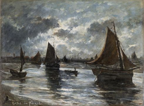 Les paysages de Bellet du Poisat doivent être observés à la lumière des échanges artistiques nourris avec ses amis artistes et collectionneurs, tels qu’Auguste Ravier, avec qui il partage le goût pour les vibrations de la couleur, ou Félix Thiollier, l’un de ses plus importants collectionneurs, qui a rassemblé dix-sept de ses tableaux, parmi lesquels figure le Clair de lune (port d’Anvers ?), composition nocturne très proche de notre Nuit dans le port où le traitement bouillonnant du ciel est caractéristique du style très personnel de l’artiste. Ils se retrouvent tous les trois autour de la notion de partage, de l’envie de transmettre, et d’une réflexion sur la nature humaine projetée dans des représentations de territoires vierges ou investis par l’homme. Devant La Nuit dans le port, le critique Bertnay écrit avec éloquence : « c’est beau et grand… Il n’y a pas de tableau au Salon dont l’impression soit aussi puissante, il n’y en a pas où l’effet grandiose rêvé par l’artiste soit aussi complètement réussi. Tout cela est peint en pleine pâte, largement, brutalement même. Là, pas de grattages, pas de dessous pour papilloter des terrains, pas de procédé habile… mais tant de forte simplicité. » Dans cette peinture émouvante, Bellet du Poisat choisit de consacrer l’essentiel de la toile à la représentation du ciel nuageux et la mer qui le reflète. La palette de gris et de bleus métalliques est agencée par des touches larges et franches qui suscitent une véritable émotion chez le spectateur, l’emportent dans une fiction, d’une nature décalée par rapport au sentiment impressionniste. Placées à différentes profondeurs, à contre-jour, les silhouettes des bateaux structurent la composition, jouent le rôle de repères pour cheminer vers la ville dans le lointain. Exposée au Salon à Paris en 1879, puis au Salon de la Société des amis des arts à Lyon l’année suivante, La Nuit dans le port traduit l’ambivalence de l’ensemble de l’oeuvre de Bellet du Poisat : prise entre les émotions suscitées par le traitement plastique du sujet et le besoin de se raccrocher à une esquisse de narration, à un argument. On ressent d’ailleurs cette dualité dans les deux poèmes écrits pour ce tableau, par Ernest d’Hervilly et Marius Grillet, puis publiés dans les livrets du Salon, qui insistent autant sur la poésie de l’oeuvre que sur sa dimension potentiellement narrative: « Sous la lune de blancs nuages / Dans le ciel en se poursuivant / Dessinent de grands paysages / Et passent, poussés par le vent… / Tandis que le port est tranquille / Que tout repose dans la nuit / On s’agite encor dans la ville / Dans les cabarets que de bruit ! » (G.P.)