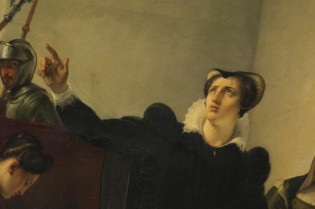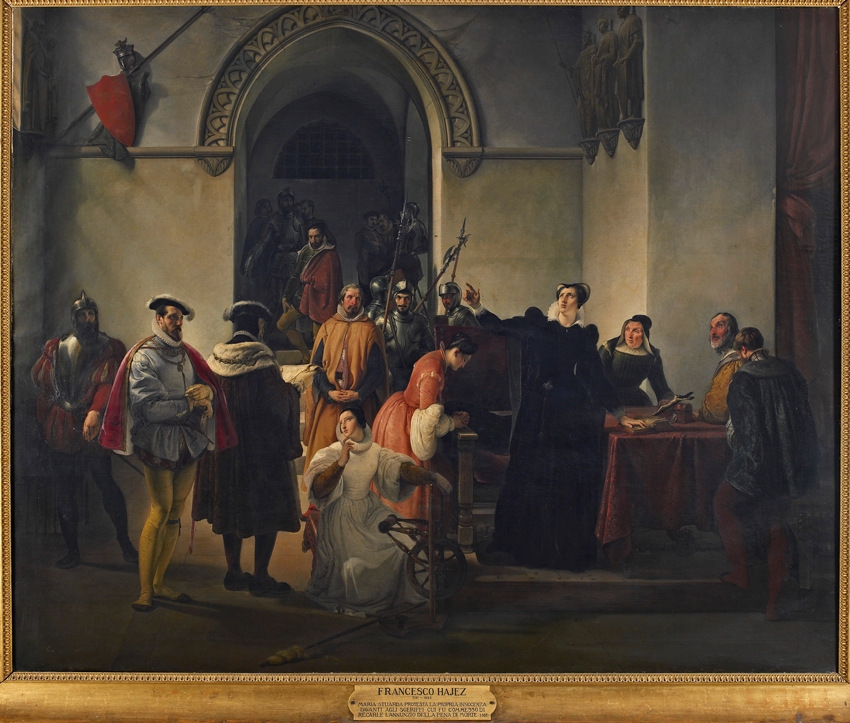 Popularisée par la tragédie de Schiller (1800), l’histoire de la reine d’Ecosse au destin tragique a la faveur des artistes et trouve ses meilleurs interprètes parmi les peintres dits « troubadours » et romantiques. La fortune artistique du personnage est particulièrement faste en 1826 : Eugène Devéria peint La Lecture de la sentence de Marie Stuart (Angers, musée des Beaux-Arts), qui suscite l’enthousiasme de Victor Hugo à l’exposition au profit des Grecs à Paris, tandis qu’à Milan paraissent la partition d’un ballet tragique, un livret de mélodrame et un calendrier populaire. C’est à ce moment que Hayez conçoit deux tableaux inspirés de l’histoire de Marie Stuart, le premier la représentant protestant de son innocence à la lecture de sa condamnation à mort, commandé par le turinois Gaetano Bertolazzone d’Arache, et le second figurant la montée à l’échafaud, destiné au baron Ludwig von Seufferheld (Milan, collection particulière).