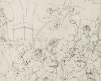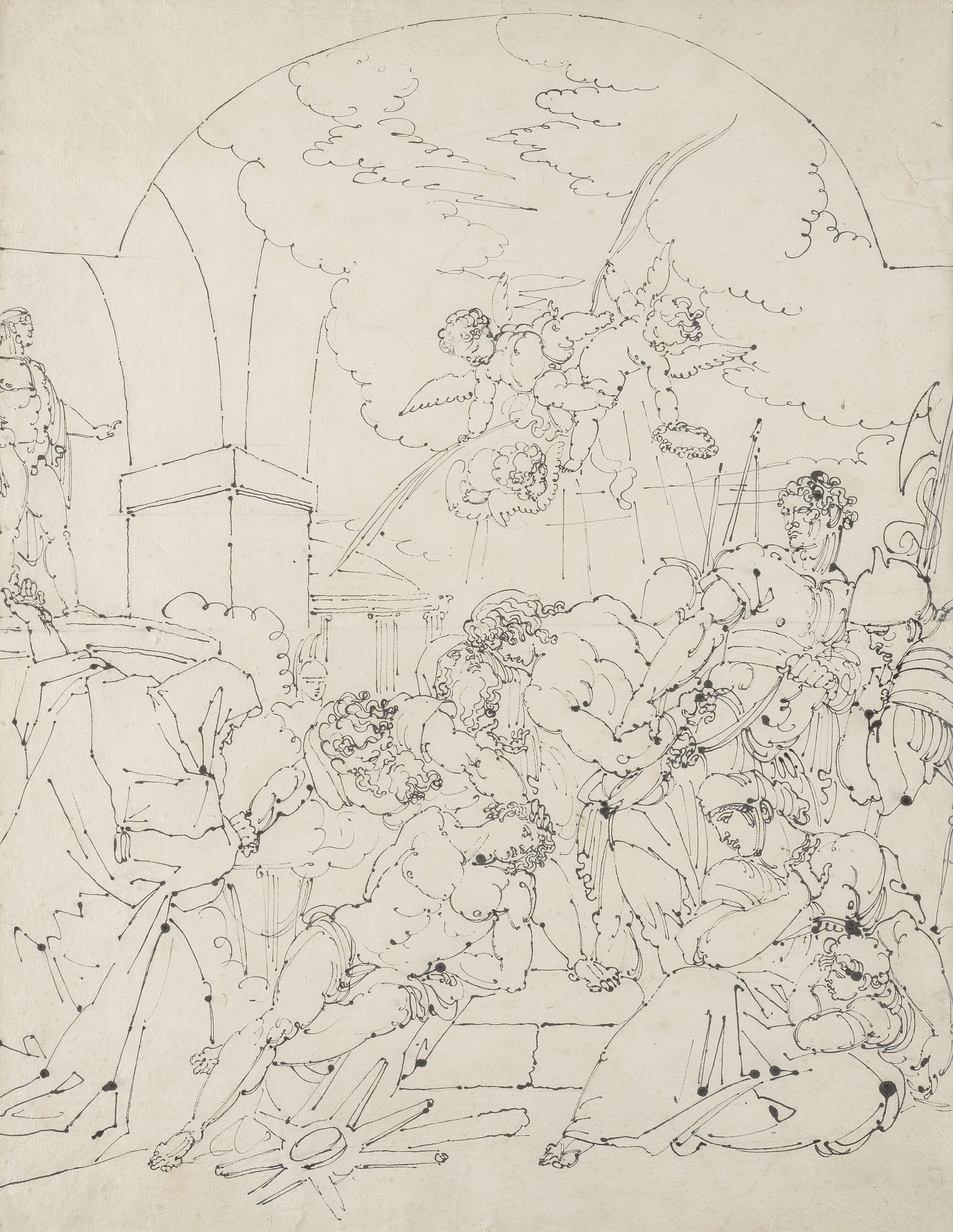 Notre scène de martyre, dont aucun attribut ne permet d’identifier les victimes avec certitude (saints Juventin et Maximin ou Cosme et Damien ?), témoigne à plus d’un titre des talents du potentiel peintre d’histoire. Le sujet religieux, chez cet artiste beaucoup plus familier du répertoire grec que de l’histoire chrétienne, suggère l’influence de la grande peinture italienne des XVI et XVIIe siècles et tendrait à situer son exécution au cours du long séjour dans la Péninsule. La feuille se distingue toutefois, par son format comme par son écriture, des lavis sommaires à vocation mnémonique que l’artiste exécute d’après les maîtres dans ses carnets. L’énergie de l’action, le canon musclé des figures et certains détails du costume (armures, coiffe féminine) pourraient faire penser à des modèles michelangesques de la seconde moitié du Cinquecento, quoique les corps soient exempts des postures contournées qui les caractérisent. Toutefois, c’est par le graphisme que Masreliez se rapproche le plus de certains grands maîtres du dessin. Lignes bouclées, plis segmentés, points d’encre d’une plume à l’arrêt qui ignore le repentir : le feu qu’il met dans son instrument rappelle les tracés fulgurants d’un Luca Cambiaso, tandis que sa manière de trousser têtes et extrémités n’est pas sans évoquer Lafage. Ce style, somme toute, reflète bien l’énergie que cultivent dans leurs dessins les artistes nordiques du cercle de Füssli, peintre charismatique présent à Rome de 1770 à 1778. Une influence contemporaine peut aussi se deviner dans le jeune saint quasi nu, la tête inclinée sous la contrainte d’un bourreau barbu et sous la menace d’un prêtre l’incitant à adorer les idoles, groupe contrasté qui ressemble à celui du jeune Troyen et de son victimaire dans les Funérailles de Patrocle que David a exposé au Palais Mancini en 1778. (M.K.)