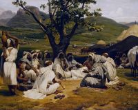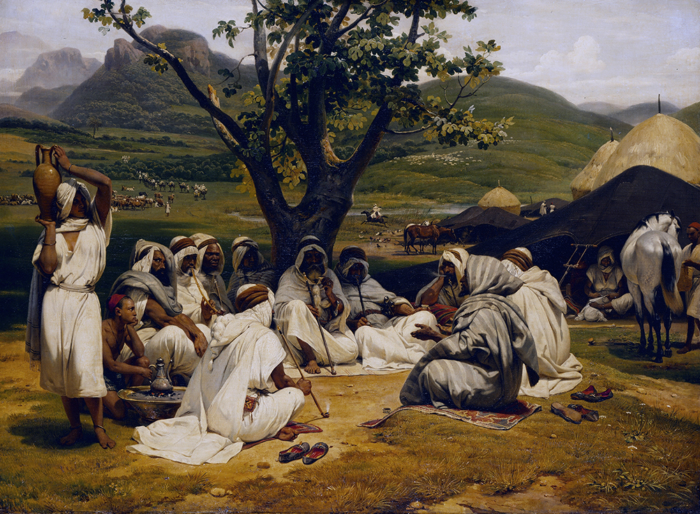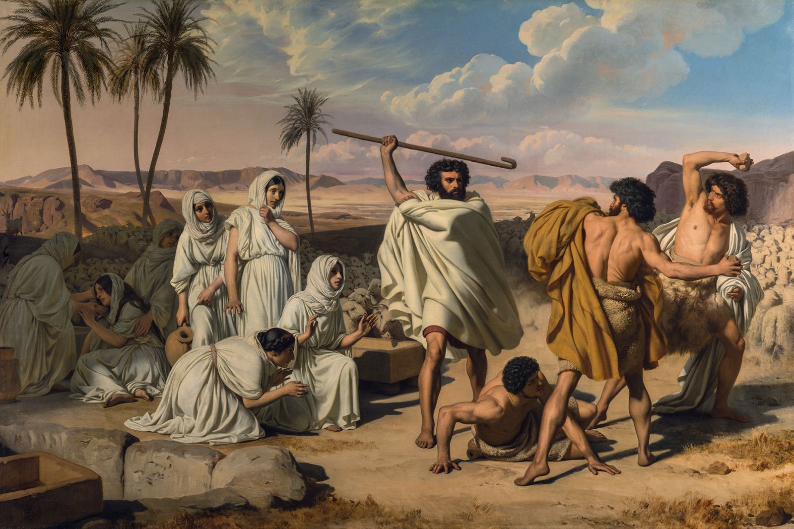La double gageure de Roger en proposant ce tableau d’histoire à la place de l’esquisse peinte attendue était de satisfaire aux exigences académiques en démontrant son excellence dans toutes les parties de l’art, mais aussi d’attirer l’attention du public dans l’exposition des travaux des pensionnaires, à Paris, par l’exotisme de la réprésentation en restituant « l’aspect de l’Arabie » (selon le mot de Papety). Les figures masculines énergiques sont la partie dans laquelle s’impose le savoir-faire académique de Roger – c’est le côté « fort bien senti » des hommes – mais, pour remplir la seconde partie de son programme, le peintre a probablement pris pour modèle la Scène d’Arabes dans leur camp, écoutant une histoire d’Horace Vernet (ill. 1), dont les draperies blanches confèrent sa couleur locale à la représentation. La réserve des femmes, qui a donné l’impression aux académiciens qu’elles ne participaient pas à l’action, peut résulter d’une méditation de l’artiste sur le modèle fixé naguère par le Serment des Horaces de David, lequel départageait les deux sexes selon leurs rôles sociaux et leurs qualités antagonistes. Mais il ne faut pas non plus négliger l’influence « nazaréenne » d’Hippolyte Flandrin, ami intime du peintre et promoteur d’un hiératisme biblique. (M.K.)