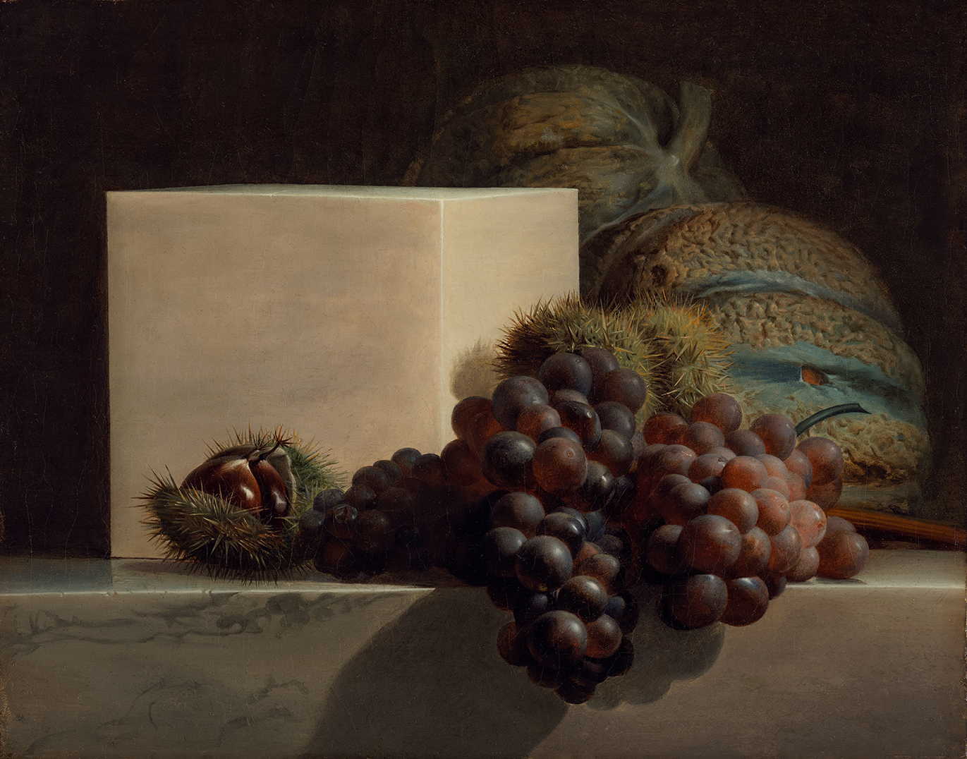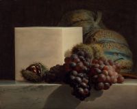 Berjon regagne Lyon en 1810 à la faveur de sa nomination comme professeur de la classe de fleurs à l’École des beaux-arts de la ville nouvellement restaurée, avec pour mission de former les dessinateurs d’une nouvelle fabrique de tissage mise au point par l’ingénieur Jacquard. En 1823, il est la victime collatérale d’un complot ourdi par Auguste de Forbin, François Artaud et Pierre Révoil, visant à placer ce dernier au poste occupé par Fleury Richard. Sous prétexte de redresser le niveau d’enseignement supposé déclinant de l’école, Berjon et son confrère Cochet sont également remplacés. Vivant dès lors retiré, il n’en continue pas moins de peindre et de former des élèves. Berjon s’impose comme l’un des grands maîtres de la nature morte du XIXe siècle. Marqué autant que Van Dael et Van Spaendonck par les modèles de la peinture hollandaise du XVIIe siècle, il maîtrise parfaitement le fini illusionniste, compose peut-être avec moins d’exubérance les tableaux de fleurs que ses deux contemporains, mais a développé des formules d’une originalité plus grande. Elle tient au contraste des matières qu’il affectionne – surfaces miroitantes et textures rugueuses – la Nature morte de fleurs, de coquillages, de tête de requin et de pétrifications (1819) du musée de Philadelphie en étant l’exemple le plus insolite. Le recours à la géométrie accuse également la modernité de son optique, qui ne se contente par de rendre le relief des choses, mais est aussi capable, au moyen de la perspective, de créer l’illusion de l’espace. Le Bouquet de lis et de roses dans une corbeille posée sur une chiffonnière (1814) du musée du Louvre pousse cette virtuosité à un niveau inégalé. Notre Nature morte aux raisins, châtaignes, courges et pain de sucre offre également un magistral exemple de cette combinaison. Berjon seul pouvait déceler le pittoresque d’un pain de sucre parfaitement cubique. Jouant par l’éclat de sa couleur le rôle souvent dévolu à l’albâtre dans ses compositions, ce solide contraste de manière « piquante » avec les cosses hérissées des châtaignes et avec la peau rugueuse des courges. Le relief de la grappe de raisin en saillie d’un parapet de marbre, poncif du genre, est remarquablement concurrencé par celui des châtaignes, pourtant en retrait, qui signent la maestria du peintre à son sommet. (M.K.)