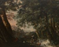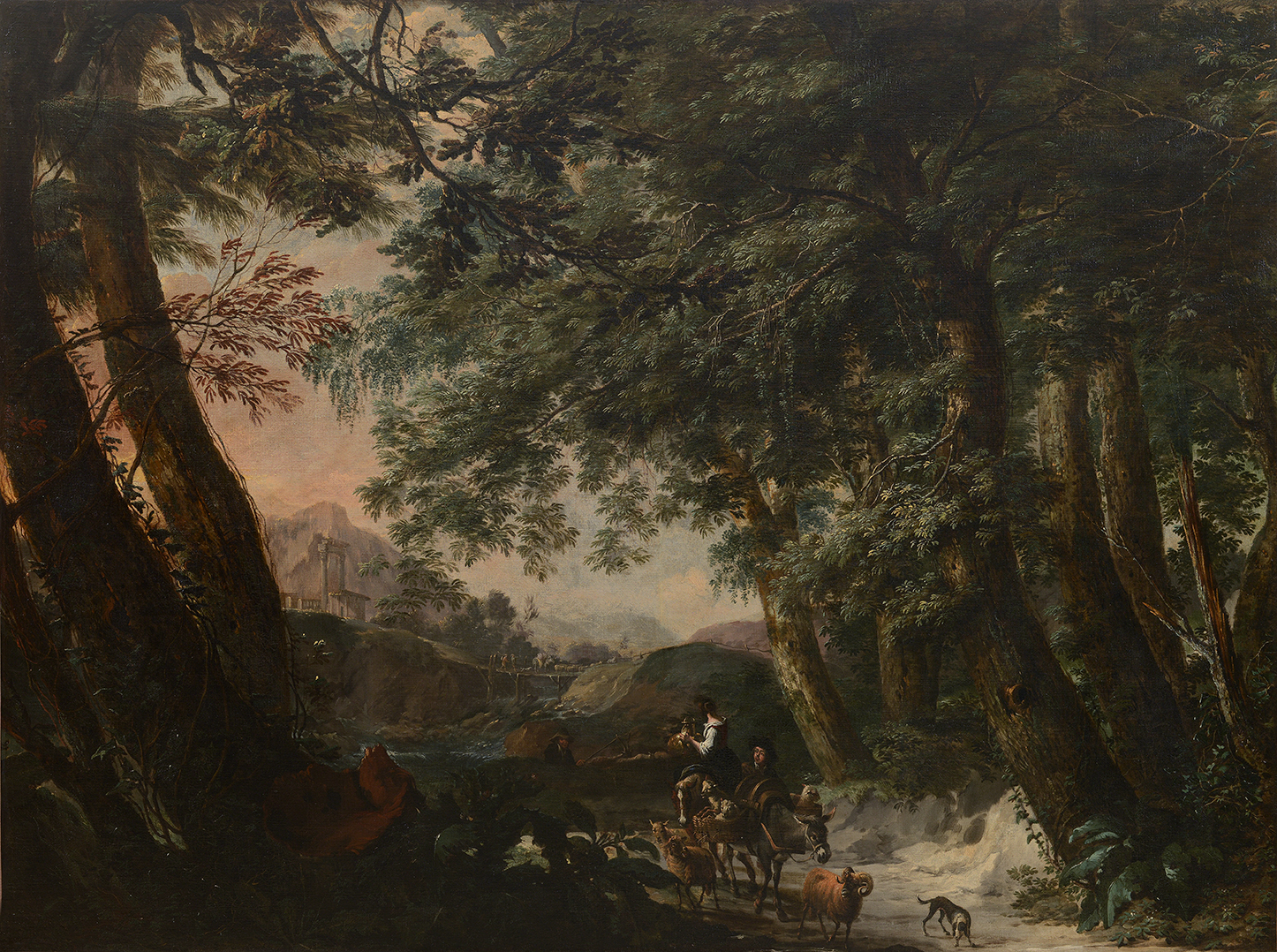 Ce paysage, acquis sans nom d’auteur et un moment rapproché de l’œuvre d’Isaac de Moucheron, vient d’être rendu au peintre flamand Philippe-Auguste Immenraet(1). La vie de cet élève de Lucas van Uden (1595-1672), au corpus relativement réduit, est encore peu documentée(2). Il est l’un des treize enfants d’un bourgeois d’Anvers facteur de clavecins. Nombre d’entre eux graviteront autour de la guilde de Saint-Luc, par leur union ou par leur activité professionnelle, tels Michel-Ange et Philippe-Auguste. Ce dernier en devient membre en 1654-1655, longtemps après son départ de l’atelier de Van Uden, vers 1647, ce qui laisse supposer une longue période de voyage. Si un séjour en Italie n’est pas attesté, il est cependant plausible, à en juger la lumière méridionale qui baigne la plupart de ses paysages ; Immenraet la maîtrise à un degré supérieur. Provenant de l’arrière-plan à gauche dans notre tableau, à une hauteur qui désigne un moment proche du crépuscule (sans que l’on puisse déterminer si c’est celui du jour ou de la nuit), cette lumière fait ressortir les troncs à contrejour à gauche, accusant leur masse et l’effet de saillie ; elle pénètre à travers le bouquet d’arbres à droite, instaurant une profondeur qui captive d’autant plus le spectateur qu’il est de plain-pied avec la scène. Le peintre ménage avec talent le contraste entre le lointain lumineux, agrémenté de ruines antiques inspiré du site de Tivoli, et l’ombre enveloppante de l’orée de la forêt.
