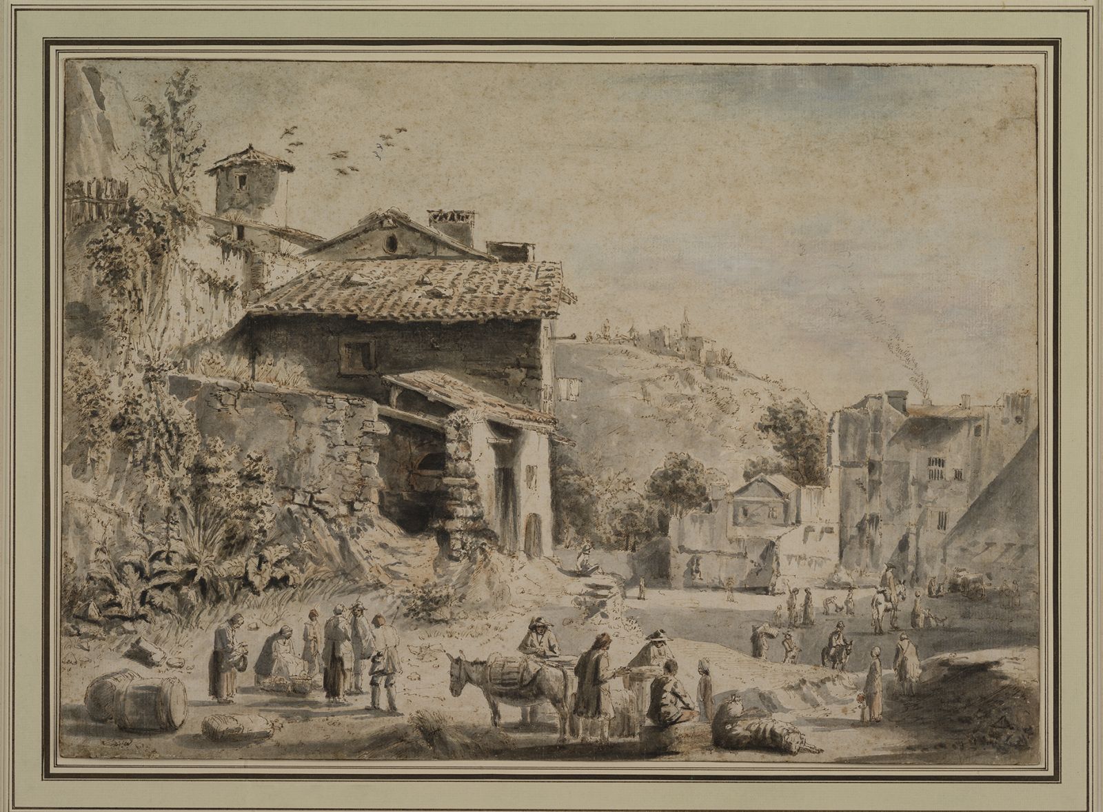 Cette indigence est aussi celle des personnages. Ce sont des figures bien connues de Boissieu qui les a croquées dans de multiples feuilles remarquables par leur vivacité et leur expressivité3. Paysannes avec enfants, tonneliers, âniers, vieillards, mendiants, c’est toute la société rurale modeste qui est évoquée dans ces croquis rapides, répertoire de figures reprises ensuite dans diverses compositions plus élaborées. Si l’agencement des figures entre elles peut paraître maladroit, l’exécution de chacune est remarquable par la rapidité du trait de plume et le soutien léger du lavis. Boissieu a exécuté plusieurs paysages relevés de personnages au tout début de sa carrière4 (ill. 2). On peut supposer qu’il cherchait son inspiration au plus près de son environnement ou de ses déplacements et sous l’influence des modèles hollandais que véhiculaient des eaux-fortes de Jan van de Velde ou Anthonie Waterloo, mais il abandonna cette pratique dès 1765, quand son voyage d’Italie avec le duc Louis-Alexandre de La Rochefoucauld lui ouvrit d’autres horizons. Il n’empêche que les compositions comme celle-ci, dans leur naïveté, sont pleines de charme. La Place d’un village est par ailleurs la plus grande feuille connue de cette période. (Marie-Félicie Perez-Pivot)