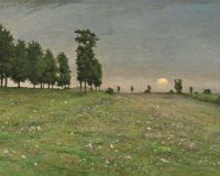 Etude préparatoire aux Ruines au soleil couchant exposées par l’artiste au Salon de 1864 (n° 385), notre Prairie à Saint-Ouen cumule toutes les caractéristiques de l’optique de Chintreuil : lumière ambiguë du crépuscule, format très étiré en largeur, accentuant l’horizontalité monotone du paysage, point de vue abaissé. Les alignements d’arbres et le raccourci entre le tapis de verdure humide de l’avant-plan et le soleil dans le lointain parviennent à mettre en perspective ce lieu sans ombre ni relief. Mais entre cette esquisse aboutie et le tableau final une singulière transformation s’est opérée : l’espace s’est dilaté, l’horizon éloigné, les objets agrandis, la plaine est devenue vallée, la déclivité distinguant désormais un promontoire surmonté de ruines (absentes de notre étude) à gauche, et la prairie à droite. Cette métamorphose, qui s’est faite presque sans affecter la composition initiale, confère une dimension épique à un site dénué de grandeur. Le sentiment cosmique qui émerge de la circulation de l’air et du rapport entre ciel et terre, dans ce tableau comme dans l’œuvre de l’artiste en général, est l’originalité qui caractérise l’art de Chintreuil. Si certains critiques du Salon de 1864 ne goûtèrent, comme Edmond About, que médiocrement ce tableau2, les hyperboles de Léon Lagrange ont bien résumé la portée, dans l’art du paysage, l’invention dont il témoigne avec l’autre œuvre présentée la même année : « M. Chintreuil se donne pour thème “Un pré ; le soleil chasse le brouillard.” Ô triomphe de l’impression ! est-ce que cela se dessine ? […] Et les Ruines au soleil couchant, qui seraient mieux nommées l’invasion du soir par le crépuscule, y faut-il tant de malices ? Le pis est que M. Chintreuil réussit à nous intéresser à ces drames. Son pré ruisselle d’humidité, sa vallée étouffe dans l’ombre. Mais, à travers ces brouillards de ce nouveau Wagner, je vois poindre le paysage de l’avenir. Désormais l’art change d’idéal. […] le paysage de l’avenir arrivera à nous donner, au lieu du Passage de la mer rouge, le passage de l’aurore au jour et à la place de la Destruction de Sodome, la destruction des localités envahies par les valeurs3. » (M.K.)