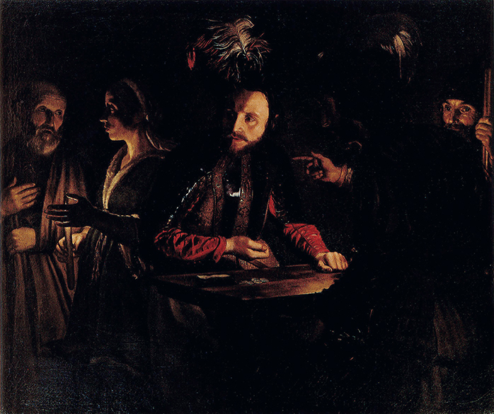 À l’instar de ses collègues caravagesques Gérard Seghers ou Théodore Rombouts, Adam de Coster jouissait à Anvers de la reconnaissance de ses pairs puisque Van Dyck a réalisé son portrait pour sa célèbre Iconographie où il est qualifié de « pictor noctium1». Le corpus de ce peintre encore peu connu compte actuellement une trentaine d’opus attribués à partir de sa seule oeuvre sûre, une gravure des Joueurs de backgammon exécutée par Lucas Vorsterman2 (ill. 1). De Coster s’est fait une spécialité des scènes nocturnes où les personnages à micorps sont éclairés par une source lumineuse artificielle, en partie masquée. À côté de Chanteurs (Vaduz, ill. 2), de Musiciens, de Joueurs, de Fumeurs, il a aussi traité des thèmes religieux comme Le Reniement de saint Pierre (ill. 3, 4). Franc-maître à la guilde des peintres d’Anvers en 1607, il n’est plus mentionné dans les archives de la ville avant 1626, année où il prend un élève dans son atelier. Cette lacune et sa manière caravagesque laissent supposer un voyage en Italie ou aux Pays-Bas au contact de Gerrit van Honthorst.