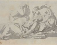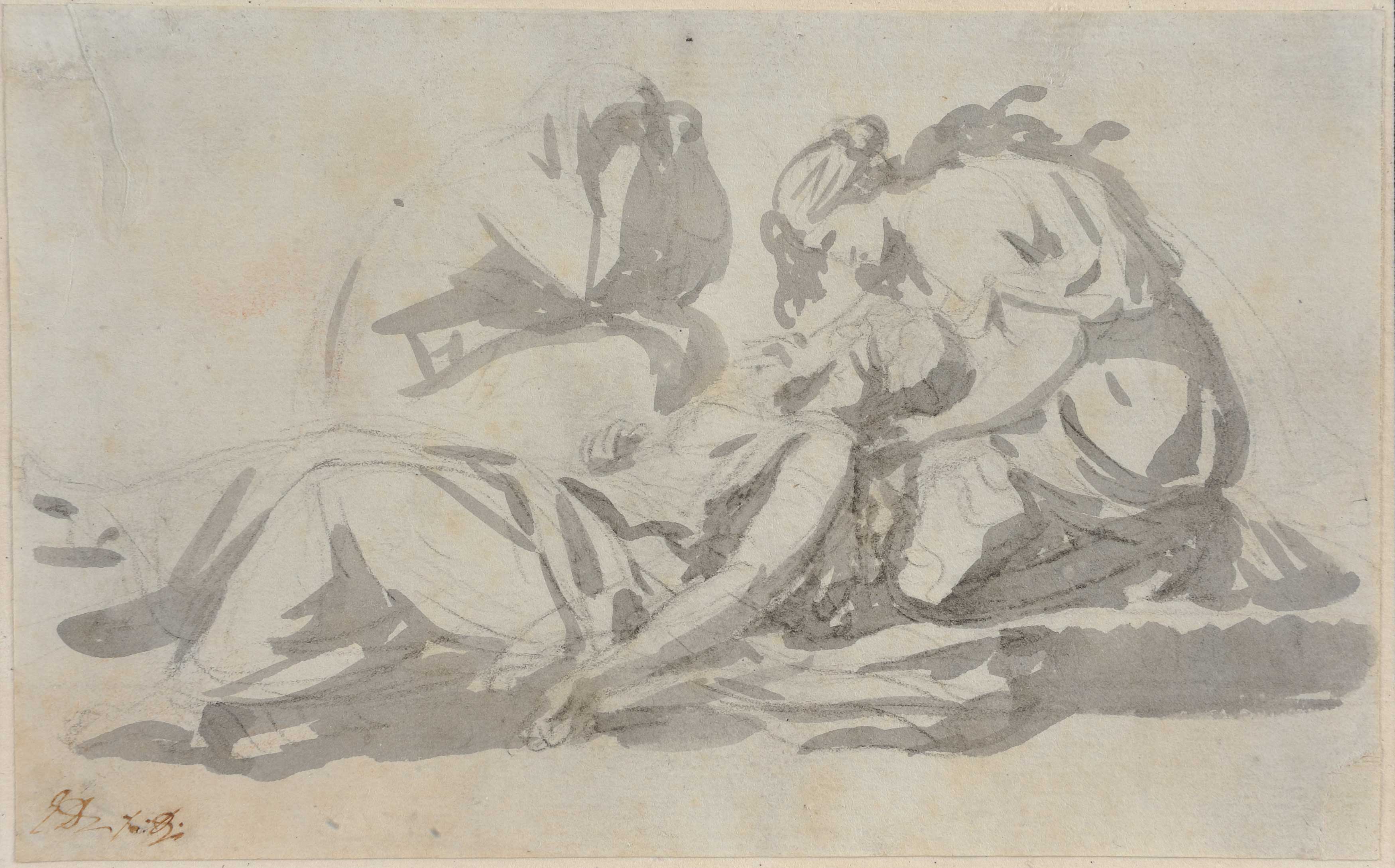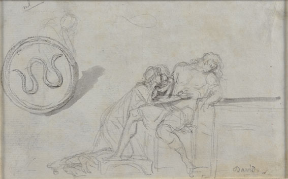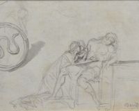 La technique de notre Scène de déploration et de son verso, est caractéristique de cette période de production graphique intense : l’application du lavis gris sur une esquisse au crayon très sommaire est l’une des techniques qu’il emploie le plus fréquemment, quel que fût le sujet. L’économie qui la caractérise répond à une exigence d’efficacité, en terme de rapidité d’exécution et d’information plastique. Cette manière de dessiner se prolonge à son retour en France, à l’automne 1780, alors qu’il explore sur le papier des sujets pour son morceau de réception. La scène de Priam aux pieds d’Achille dessinée au verso s’inscrit manifestement dans ces recherches. Comme il s’agit d’une composition de son invention, quoique influencée par un bas-relief romain, on serait tenter de voir aussi dans la Scène de déploration une pensée originale plutôt qu’une copie d’après l’antique ou un maître italien. Elle peut-être rapprochée du groupe de Camille tuée par Horace vainqueur esquissé en 1781 ou 1782 au dos d’un dessin de la Mort de Socrate. La coexistence de ces trois sujets montre que le peintre, au moment d’accomplir un pas décisif dans sa carrière – sa réception comme membre de l’Académie – hésite entre plusieurs genres d’histoire : la pathos homérique (Priam), l’antiquité violente (Camille) et l’exemplum virtutis (Socrate). Il choisira le premier, en se portant toutefois vers un sujet plus théâtral, la douleur d’Andromaque.