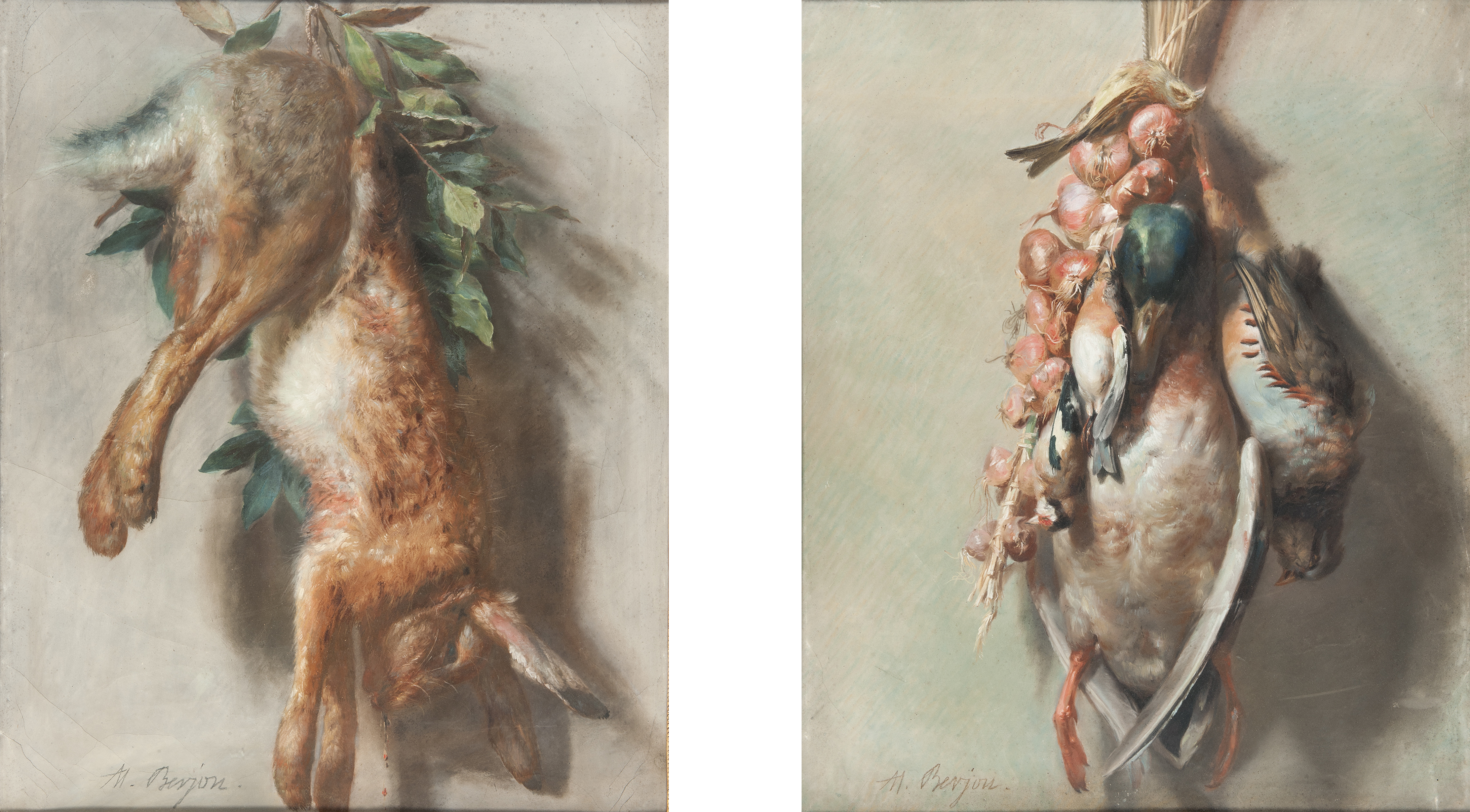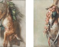 Trophée de chasse au lièvre et laurier ;Trophée de chasse au colvert, perdrix, chardonneret, bouvreuil, moineau et oignons