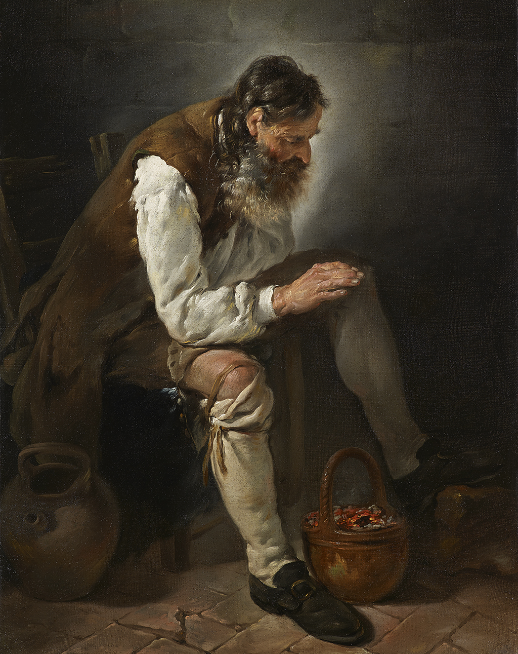S’il a réalisé des tableaux pour les églises et palais de Dresde, les dommages subis par ses oeuvres au fil des siècles rendent le peintre d’histoire difficile à évaluer. Hutin est aujourd’hui plus connu pour ses tableaux de genre représentant des figures du peuple saxon isolées dans des intérieurs rustiques. Unique par ses dimensions dans le corpus connu de l’artiste, et jusqu’à présent inédit, Un paysan saxon est, en quelque sorte, l’oeuvre étalon qui permet de mieux apprécier son talent. Par sa composition, son dépouillement, le rejet de toute affectation, elle pourrait passer pour le pendant de la Villageoise saxonne dans une cuisine du musée du Prado (ill. 1), si ce n’était ses proportions de grandeur naturelle. L’idée de projeter au format d’un portrait d’apparat l’humble personne d’un paysan témoigne des ressources créatives de l’artiste et le démarque de contemporains tels que Lépicié ou Noël Hallé, dont il partage le répertoire – notre vieillard n’est pas sans rappeler celui présenté par le second au Salon de 1747, en petit, mais pareillement mal chaussé3 (ill. 2).