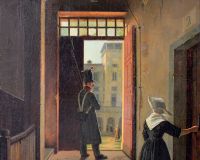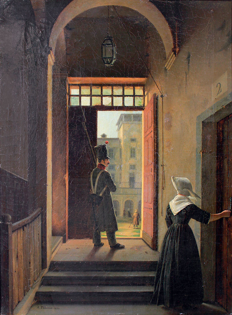 Un parallèle troublant peut être établi avec la toile d’Augustin Alexandre Thierriat (1789-1870) conservée au musée des Hospices Civils de Lyon (ill. 1). Ancien élève de Révoil et Grognard, pas encorenommé professeur à l’École des beaux-arts de Lyon, il peint en 1821, presque concomitamment à Jacquand, une scène montrant un soldat et une religieuse, pareillement localisée à tort dans une cour de l’hôtel-Dieu lyonnais. La proximité des sujets témoigne certainement d’échanges entre les deux artistes, amenés à fréquenter régulièrement le palais Saint-Pierre qui abritait le musée depuis 1803 et l’École des beaux-arts depuis 1807.