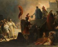 Le fils de l’illustre Jean-Honoré Fragonard est l’un des grands peintres méconnus de la période romantique : virtuose, fécond, doué d’un sens supérieur de la dramaturgie, considéré par Adolphe Thiers comme l’un des artistes les plus talentueux de sa génération, Alexandre-Évariste a été peu à peu oublié à la fin de sa vie. L’histoire de ce tableau est à l’image de sa postérité : regardé sans être vu, au point qu’il en a perdu à la fois son titre et son nom. Il est passé pendant près d’un siècle pour une œuvre de Thomas Couture, en raison d’un monogramme abusif qui, faute de convaincre, a déclassé l’œuvre et égaré les spécialistes. Personne n’y a reconnu la main de Fragonard jusqu’à ce que le hasard nous mette en présence de ce tableau en 2013. Identifié successivement à « la lecture de la sentence de condamnation des Templiers », à « Jeanne d’Arc présentée au souverain », le sujet pourrait se rattacher par les costumes au siècle de François 1er ; mais il a également été proposé d'y voir le dévouement des bourgeois de Calais.