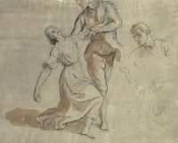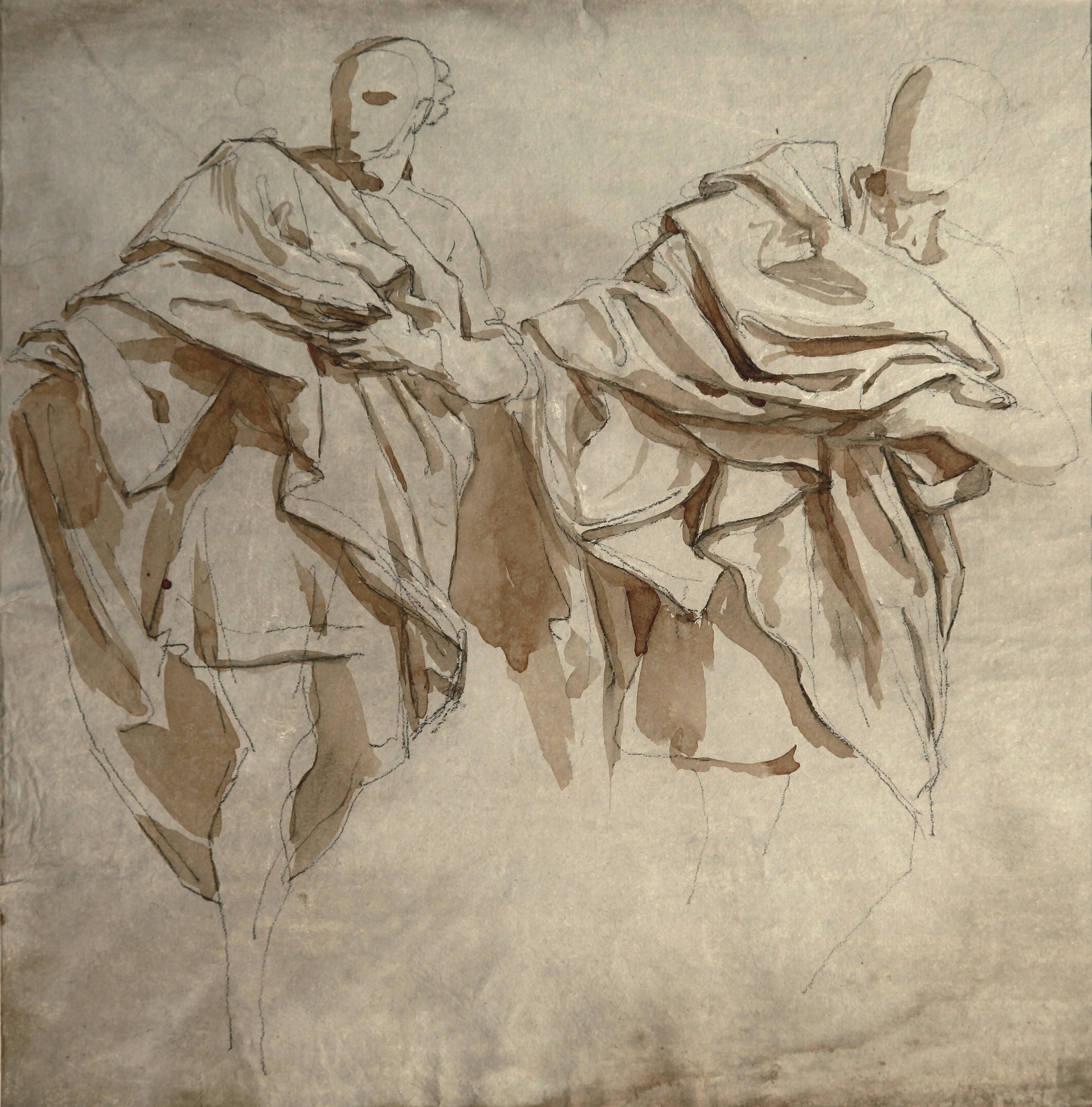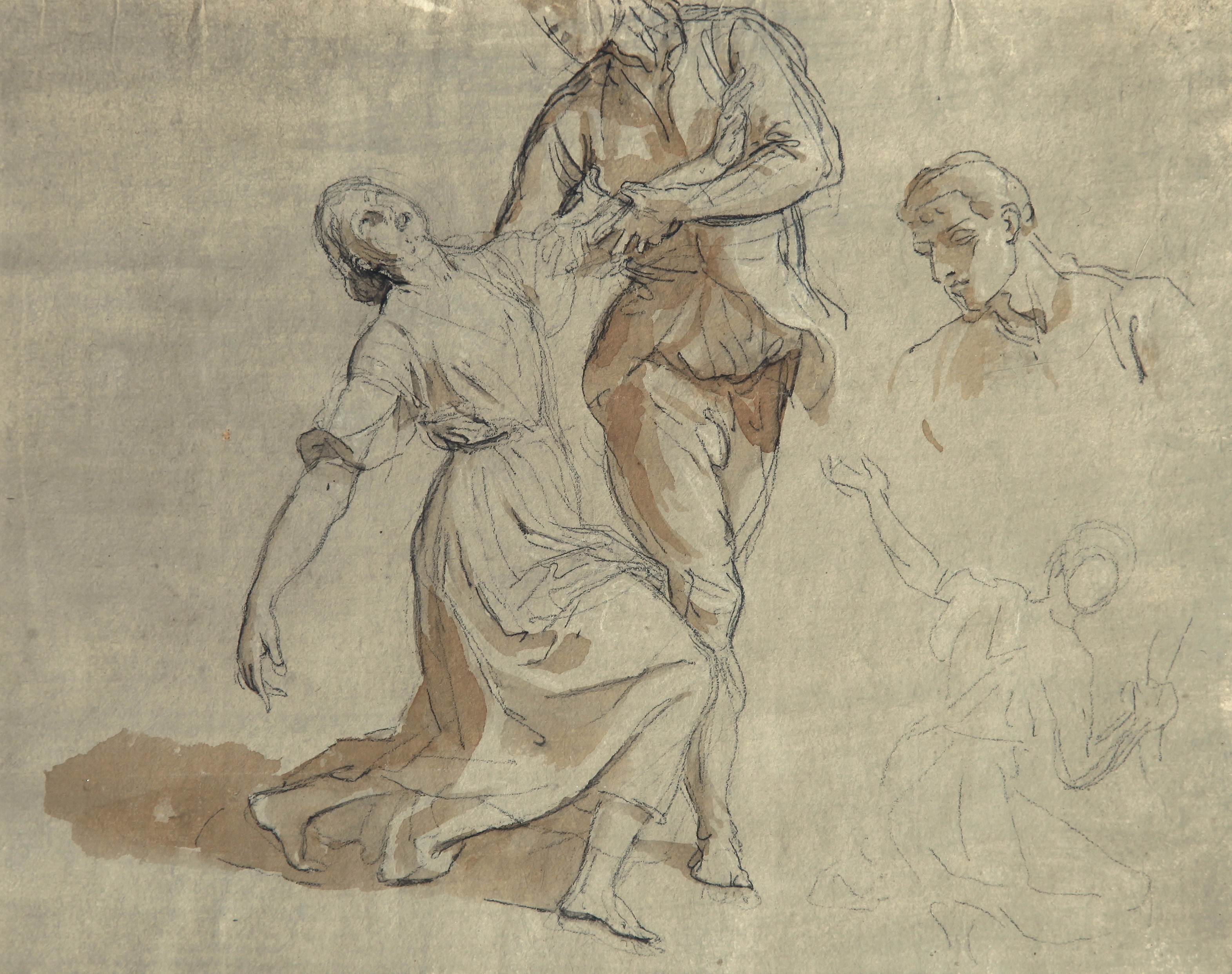 On conserve cinq dessins au crayon noir et lavis brun ou gris de figures pour cette composition : une feuille montre parmi d’autres celle du licteur assis sur les marches du trône (repris du Diogène de L’École d’Athènes de Raphaël) ; une autre le groupe de Virginie et l’homme qui la relève, en costume moderne, avec reprise du buste de ce dernier et croquis de la jeune femme agenouillée de dos ; une double étude pour le même homme, cette fois drapé à l’antique[xi] ; une autre double étude du même, où il trouve l’inclinaison à droite que retiendra le tableau, avec une étude pour le licteur debout derrière Virginie. Une dernière feuille est consacrée au spectateur de dos à droite.