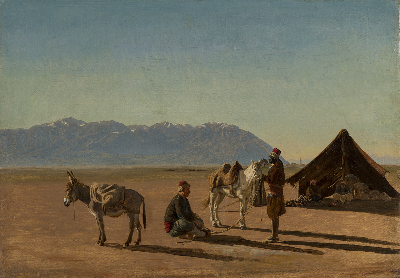 L’oeuvre la plus ambitieuse qu’il ait laissée est une ample vue des environs de Sardes, commandée par le brasseur Jacob Christian Jacobsen et achevée à Rome l’année de sa mort (Copenhague, Statens Museum for Kunst). Elle est la somme d’études que le peintre a faites au cours d’excursions dans la plaine lydienne en compagnie du consul de Smyrne W. Spiegel2. À la différence de ce paysage épique, dans lequel le peintre a poussé la virtuosité de l’exécution aussi loin qu’il le pouvait, Voyageurs se reposant sur la route de Sardes est semblable à une page de carnet de voyage saisissant un moment du quotidien. Le modeste campement s’éveille dans un site grandiose, dont l’échelle est donnée par la silhouette d’un village se découpant à l’horizon au pied de la montagne. En plus du charme plaisant de l’exotisme, ce contraste entre le proche et le lointain révèle l’intelligence pittoresque du peintre, tandis que la qualité de la lumière du soleil levant signale en lui un héritier de l’Âge d’or danois. (M.K.)