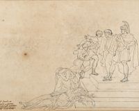 Drame cornélienUn dessin inédit de David se rattache au Serment des Horaces, tableau fondateur de la peinture française. Le peintre a d’abord exploré sur le papier différents moments de la tragédie de Corneille. Lorsque Horace, héros de la Rome primitive, est rentré dans la cité victorieux de son combat contre les Curiaces, il a trouvé sur son passage sa sœur Camille pleurant la mort de son époux, ennemi de la patrie. Furieux de voir son exploit aussi lamentablement accueilli, Horace la tue. Son père le défendra à son procès en faisant valoir la supériorité de l’honneur patriotique sur la passion amoureuse : c’est le sujet de ce dessin montrant le vieil Horace déployant toute son éloquence pour sauver son dernier fils, lequel campe une attitude pleine de mépris et d’assurance au-dessus du cadavre encore frémissant de sa sœur.