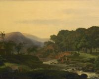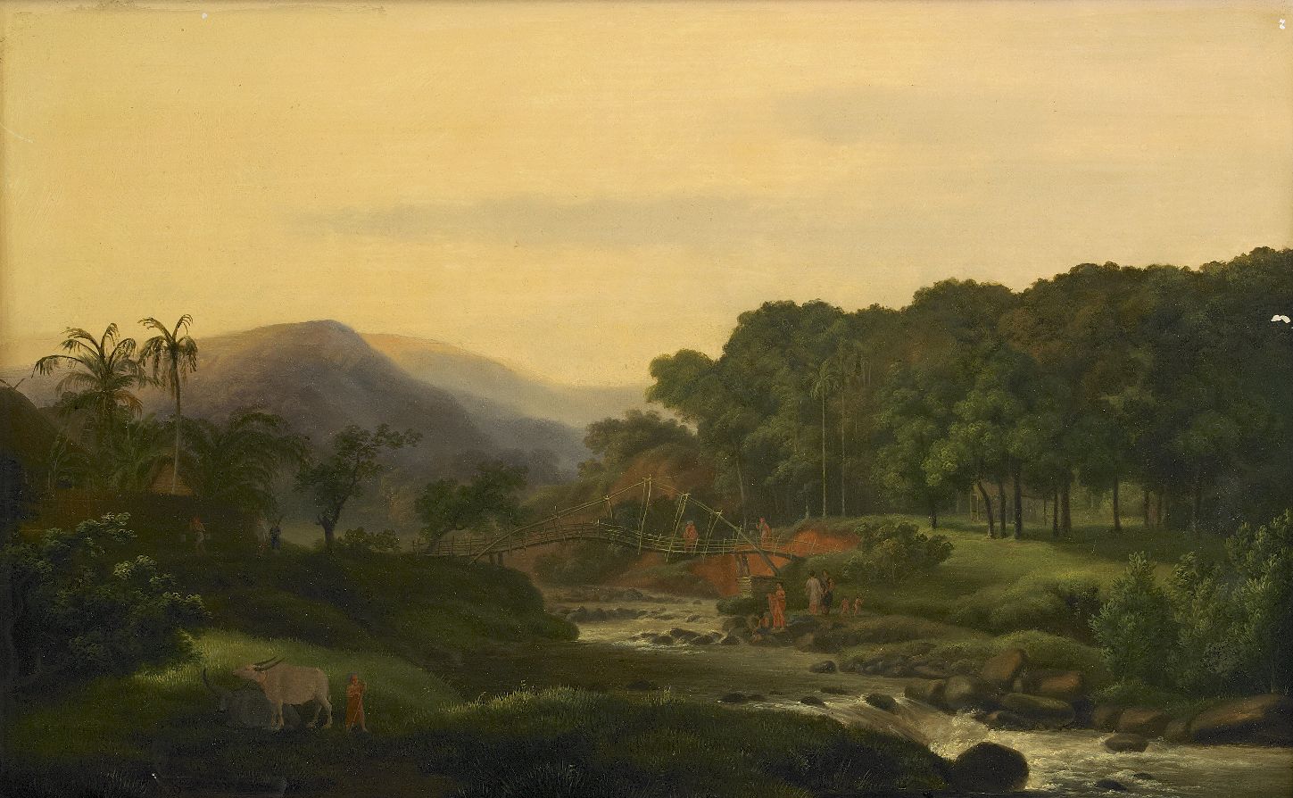 Idylle javanaiseLa mission du peintre néerlandais Antoine Payen à Java, de 1817 à 1826, constitue un chapitre majeur de la découverte des Indes orientales par les Européens au début du XIXe siècle. Chargé par le gouvernement de « former une collection de vues de ce pays qui, réunies en Europe, donneraient une juste idée de la physionomie de ces contrées », il parcourut tout l’archipel indonésien, remplissant ses carnets de croquis sur le vif. Le Pont de bambou sur la rivière Tjisadane à Bogor est l’une de ses premières œuvres et l’un des petits panneaux qu’il peignit pour le compte du gouverneur de l’île en guise de préparation à des toiles plus ambitieuses. Sauvé de l’incendie et du naufrage de la frégate du gouverneur en 1819, il parvint après bien des vicissitudes aux Pays-Bas. Payen y a dépeint la douce vie qui s’écoule dans la campagne javanaise avec les moyens appris de Valenciennes, le père du paysage historique moderne.
