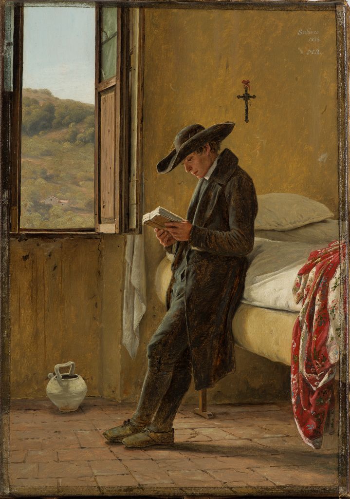 Chambre avec vueMartinus Rørbye est sans doute le plus nomade des peintres de l’Âge d’or danois, le premier à franchir les frontières habituelles du Grand Tour en voyageant en Grèce et en Turquie. Mais c’est l’Italie qui l’a plus souvent retenu. Séjournant à Subiaco en 1836, il y a produit l’une des images les plus séduisantes dans le genre de la « chambre avec vue », cher aux jeunes artistes étrangers désireux de fixer leur passage dans ce qui leur semblait un paradis d’artistes. Dans le Jeune abbé lisant, Rørbye a transposé avec une grande virtuosité l’étude du plein air dans un intérieur rempli de lumière. Icône de la peinture danoise du XIXe siècle, l’œuvre n’était jusqu’à présent connue que par une réplique tardive de la Ny Carlsberg Glyptotek.