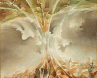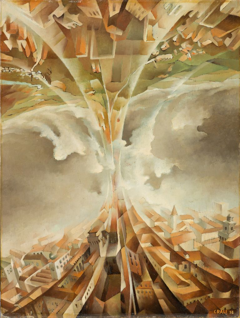 Looping futuristeGran volta de Tullio Crali est un témoignage exceptionnel de l’évolution du futurisme à la fin des années 1930. En 1929, Filippo Marinetti, chef de file du mouvement, et ses amis tentent de définir théoriquement « l’aéropeinture » et « l’aéropoésie » dans un manifeste qui circulera jusqu’à la Seconde Guerre mondiale. Dans ce texte fondateur, ils affirment que « les perspectives changeantes de vol constituent une réalité absolument nouvelle, et qui n’a rien de commun avec la réalité traditionnelle des perspectives terrestres ». Tullio Crali est le premier a mettre en pratique ces nouvelles théories modernistes. Dans Gran volta (Grande voûte), il montre simultanément, sur une même surface plane, les points de vue observables depuis un avion durant deux phases d’un looping. L’œuvre a fait partie de la collection de Marinetti.