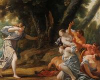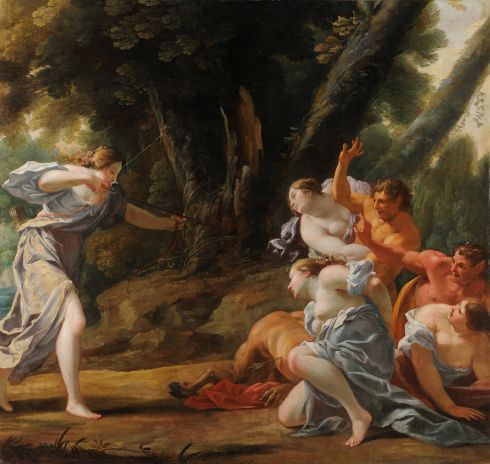 Déesse punitiveLes tableaux mythologiques de l’atelier de Simon Vouet sont rares. On ne conserve tout au plus qu’une quinzaine de ces toiles jadis destinées à orner les plus fastueux hôtels particuliers et châteaux sous le règne de Louis XIII. Découverte récente, Diane pourchassant les satyres est dans ce genre une œuvre de premier ordre. Elle est attribuée à Nicolas Chaperon, l’un des élèves de Vouet les plus talentueux, avec Le Sueur, Le Brun et Dorigny, quoiqu’il soit encore méconnu. L’œuvre met en scène la chaste et farouche reine des bois volant au secours de ses nymphes assaillies par des satyres. Thème qui rencontre un grand succès dans les décors profanes parisiens des années 1630, la confrontation entre chasteté et perversité est traité par le peintre avec une verve exceptionnelle et une évidente truculence.