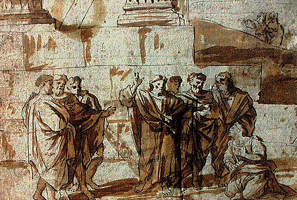 Ascribed to Poussin in the eighteenth century, then to Sébastien Bourdon in the twentieth, Christ and the Woman of Canaan belongs to the group of once variously attributed pictures which Jennifer Montagu suggested as being by the “Master of Cleobis and Biton”; her cautious identification of this painter with the young Blanchet played its part in putting together the corpus of his Roman period.2 The stocky figures and the faces with their enormous almondshaped eyes are typical of Blanchet, as is an approach to ruins that contrasts the puissant nobility of antiquity in the foreground with the various buildings and ruins in the background, all painted in shades of creamy brown-beige. At the centre of the lower register is the episode from the Bible: a woman from pagan Canaan has put her faith in the God of Israel and is begging Jesus to save her daughter, possessed by a demon. Jesus is initially silent, then openly disdainful of this member of an idolatrous people; but when she compares herself to a dog eating the crumbs that fall from his master’s table, he recognises the greatness of her faith and cures her daughter.