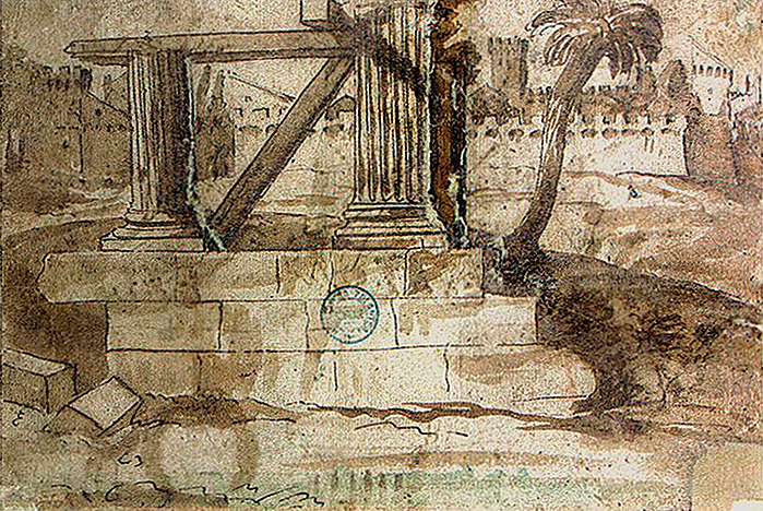 While the scene gives the picture an evangelical feel, its smallness and the overwhelming presence of the temple betray the artist’s intention to make the landscape his main subject. A preliminary sheet discovered by Karen Chastagnol in the Biblioteca Zelantea in Acireale3 makes it clear that the scene on the recto (ill. 1) was not an integral part of the landscape on the verso (ill. 2), which is bare of all human presence; rather it was an addition of the kind that could have included any other historiated episode. The detail of the little dog that colourfully enlivens the foreground slips in a prosaic element worthy of the bamboccciate of the time.