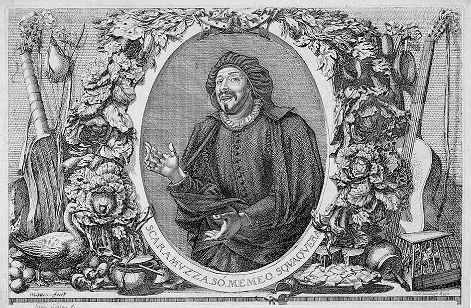Scaramouche (or Scaramuccia) has his origins in the capitan, the quarrelsome Neapolitan with a tendency to flee the fights he regularly provokes. While keeping the character’s black suit, typical of the Spanish nobility, Fiorilli modified him by doing away with the sword and the mask. As Teresa Megale3 points out, Fiorilli’s long and spectacular career, begun within his family circle, was studded with endless successes; devoid of crises and flat periods, it soon became the stuff of myth. Considered Molière’s master and coming in the wake of Tristano Martinelli and Giovan Battista Andreini, the Neapolitan actor made a decisive contribution to the success and the establishment of Italian theatre in France. With his vivacity, agility and mastery of the precise, unexpected gesture, he expanded the boundaries of mere recitation, making the most of his gift for mimicry to win the favour of foreign audiences as well. Black-clad like Scaramouche, that comic composite of the zanni and the capitan, he replaced the sword with a guitar and the mask with his own features; on stage he was able to play music, sing and dance, and “with his bodily postures and his grimaces [could] imitate anybody and anything he wished.”4