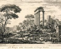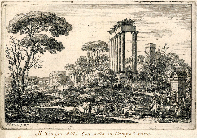 Bearing the clear stamp of the vedutist’s art, this capriccio takes its inspiration from the repertoire of motifs to be found in Duflos’s prior engravings: thus the Temple of Concord (ill. 1) and rustic buildings typical of the Italian countryside are added to a Rhône river topography suffused with a light more French than meridional. While small, the highly natural fi gures demonstrate Duflos’s excellence in a domain he would expand on in two altar paintings for the Sainte-Croix church, now lost.